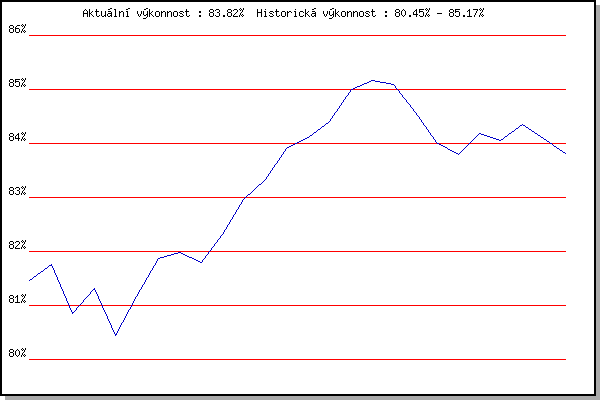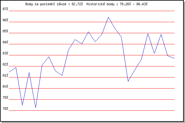 ZávodBodyVýkonnostZměna| 04.05.2016 | Líšeň, 11 km | 81.46% | 81.46% | | | 25.05.2016 | Obřany, 8.8 km | 81.89% | 81.76% | +0.30% | | 01.06.2016 | Líšeň, 11 km | 78.47% | 80.86% | -0.90% | | 29.06.2016 | Obřany, 8.8 km | 81.45% | 81.31% | +0.45% | | 13.07.2016 | Atletický stadión Pod Palackého vrche | 78.26% | 80.45% | -0.86% | | 03.08.2016 | Obřany, 8.8 km | 82.11% | 81.16% | +0.71% | | 17.08.2016 | Líšeň, 11 km | 82.87% | 81.88% | +0.72% | | 31.08.2016 | Atletický stadión Pod Palackého vrche | 81.57% | 81.99% | +0.11% | | 24.05.2017 | Obřany, 8.8 km | 81.16% | 81.80% | -0.19% | | 31.05.2017 | Líšeň, 11 km | 83.51% | 82.32% | +0.52% | | 28.06.2017 | Obřany, 8.8 km | 84.41% | 82.96% | +0.64% | | 16.08.2017 | Obřany, 8.8 km | 84.02% | 83.33% | +0.37% | | 06.09.2017 | Líšeň, 11 km | 85.11% | 83.90% | +0.57% | | 13.09.2017 | Pisárky Anthropos, 6 km | 84.23% | 84.11% | +0.21% | | 23.05.2018 | Obřany, 8.8 km | 84.83% | 84.40% | +0.29% | | 30.05.2018 | Líšeň, 11 km | 86.43% | 84.99% | +0.59% | | 25.07.2018 | Líšeň, 11 km | 85.41% | 85.17% | +0.18% | | 01.08.2018 | Pisárky Anthropos, 6 km | 84.64% | 85.09% | -0.08% | | 22.08.2018 | Palackého vrch, 7.1 km | 80.63% | 84.57% | -0.52% | | 21.08.2019 | Atletický stadión Pod Palackého vrche | 81.63% | 84.01% | -0.56% | | 04.09.2019 | Hotel Myslivna, 7 km | 82.62% | 83.79% | -0.22% | | 01.07.2020 | Atletický stadión Pod Palackého vrche | 84.95% | 84.18% | +0.39% | | 02.09.2020 | Líšeň, 11 km | 83.18% | 84.06% | -0.12% | | 09.09.2020 | Pisárky Anthropos, 6 km | 84.89% | 84.36% | +0.30% | | 25.08.2021 | Líšeň | 82.95% | 84.09% | -0.27% | | 01.09.2021 | Obřany | 82.72% | 83.82% | -0.27% | | | | |