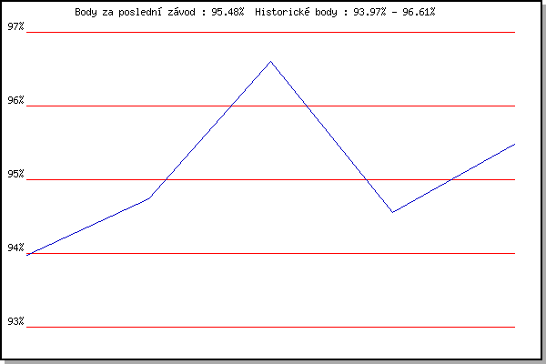 Závod| Body | Výkonnost | Změna | 24.05.2006 | Obřany, 8.8 km | 93.97% | 93.97% | | 07.06.2006 | Líšeň Mariánské údolí, 11.1 km | 94.74% | 94.50% | +0.53% | 12.07.2006 | Obřany, 8.8 km | 96.61% | 95.65% | +1.15% | 16.05.2007 | Pisárky Anthropos, 6.6 km | 94.56% | 95.31% | -0.34% | 30.05.2007 | Líšeň Mariánské údolí, 11.1 km | 95.48% | 95.43% | +0.12% | | |