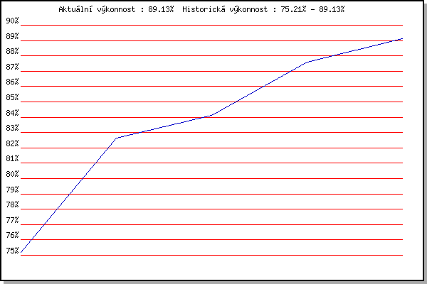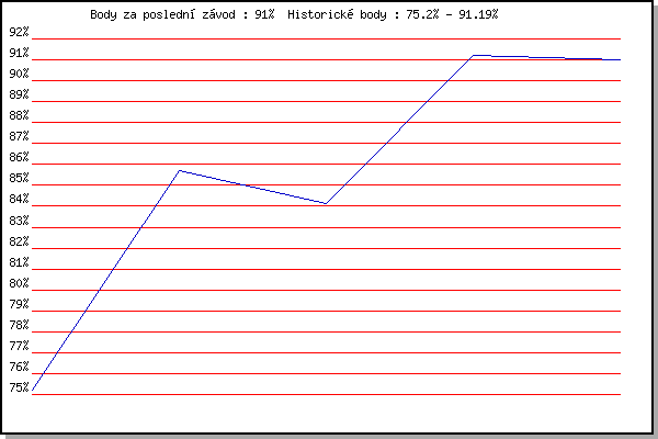 Závod| Body | Výkonnost | Změna | 24.05.2017 | Obřany, 8.8 km | 75.20% | 75.21% | | 07.06.2017 | Pisárky Anthropos, 6 km | 85.72% | 82.65% | +7.44% | 30.08.2017 | Atletický stadión Pod Palackého vrche | 84.11% | 84.12% | +1.47% | 25.04.2018 | Atletický stadión Pod Palackého vrche | 91.19% | 87.61% | +3.49% | 06.06.2018 | Pisárky Anthropos, 6 km | 91.00% | 89.13% | +1.52% | | |