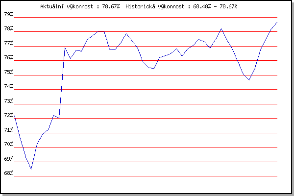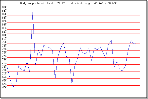 ZávodBodyVýkonnostZměna| 26.04.2017 | Pisárky Anthropos, 6 km | 72.17% | 72.17% | | | 03.05.2017 | Hotel Myslivna, 7 km | 68.61% | 70.61% | -1.56% | | 24.05.2017 | Obřany, 8.8 km | 66.74% | 69.32% | -1.29% | | 31.05.2017 | Líšeň, 11 km | 66.81% | 68.48% | -0.84% | | 14.06.2017 | Popůvky, 7.9 km | 72.70% | 70.21% | +1.73% | | 21.06.2017 | Palackého vrch, 7.1 km | 71.54% | 70.88% | +0.67% | | 28.06.2017 | Obřany, 8.8 km | 71.18% | 71.22% | +0.34% | | 19.07.2017 | Pisárky Anthropos, 6 km | 73.82% | 72.22% | +1.00% | | 26.07.2017 | Palackého vrch, 7.1 km | 70.87% | 72.00% | -0.22% | | 09.08.2017 | Hotel Myslivna, 7 km | 88.08% | 76.90% | +4.90% | | 16.08.2017 | Obřany, 8.8 km | 72.91% | 76.15% | -0.75% | | 23.08.2017 | Popůvky, 7.9 km | 77.25% | 76.72% | +0.57% | | 30.08.2017 | Atletický stadión Pod Palackého vrche | 75.36% | 76.64% | -0.08% | | 25.04.2018 | Atletický stadión Pod Palackého vrche | 78.66% | 77.43% | +0.79% | | 09.05.2018 | Popůvky, 7.9 km | 77.66% | 77.74% | +0.31% | | 16.05.2018 | Palackého vrch, 7.1 km | 77.98% | 78.04% | +0.30% | | 23.05.2018 | Obřany, 8.8 km | 77.15% | 78.04% | 0.00% | | 11.07.2018 | Hotel Myslivna, 7 km | 68.84% | 76.79% | -1.25% | | 18.07.2018 | Obřany, 8.8 km | 75.26% | 76.75% | -0.04% | | 25.07.2018 | Líšeň, 11 km | 77.75% | 77.23% | +0.48% | | 01.08.2018 | Pisárky Anthropos, 6 km | 79.17% | 77.88% | +0.65% | | 08.08.2018 | Hotel Myslivna, 7 km | 75.24% | 77.36% | -0.52% | | 15.08.2018 | Popůvky, 7.9 km | 74.86% | 76.88% | -0.48% | | 22.08.2018 | Palackého vrch, 7.1 km | 67.32% | 75.93% | -0.95% | | 29.08.2018 | Atletický stadión Pod Palackého vrche | 72.72% | 75.49% | -0.44% | | 05.09.2018 | Obřany, 8.8 km | 74.72% | 75.48% | -0.01% | | 12.09.2018 | Pisárky Anthropos, 6 km | 77.82% | 76.21% | +0.73% | | 17.04.2019 | Atletický stadión Pod Palackého vrche | 76.09% | 76.35% | +0.14% | | 24.04.2019 | Pisárky Anthropos, 6 km | 76.31% | 76.47% | +0.12% | | 29.05.2019 | Líšeň, 11 km | 77.62% | 76.84% | +0.37% | | 05.06.2019 | Palackého vrch, 7.1 km | 74.02% | 76.32% | -0.52% | | 12.06.2019 | Popůvky, 7.9 km | 77.79% | 76.80% | +0.48% | | 19.06.2019 | Atletický stadión Pod Palackého vrche | 77.23% | 77.05% | +0.25% | | 26.06.2019 | Pisárky Anthropos, 6 km | 78.27% | 77.47% | +0.42% | | 24.07.2019 | Líšeň, 11 km | 76.39% | 77.30% | -0.17% | | 07.08.2019 | Hotel Myslivna, 7 km | 75.00% | 76.86% | -0.44% | | 14.08.2019 | Palackého vrch, 7.1 km | 78.81% | 77.45% | +0.59% | | 28.08.2019 | Obřany, 8.8 km | 80.01% | 78.21% | +0.76% | | 04.09.2019 | Hotel Myslivna, 7 km | 72.11% | 77.48% | -0.73% | | 11.09.2019 | Pisárky Anthropos, 6 km | 73.90% | 76.80% | -0.68% | | 05.08.2020 | Popůvky, 7.9 km | 71.51% | 75.93% | -0.87% | | 12.08.2020 | Palackého vrch, 7.1 km | 71.29% | 75.07% | -0.86% | | 19.08.2020 | Obřany, 8.8 km | 72.66% | 74.65% | -0.42% | | 02.06.2021 | Pod Palackého vrchem 10 km | 77.05% | 75.41% | +0.76% | | 09.06.2021 | Pisárky | 79.89% | 76.73% | +1.32% | | 16.06.2021 | Palackého vrch | 78.89% | 77.49% | +0.76% | | 23.06.2021 | Obřany | 79.23% | 78.17% | +0.68% | | 30.06.2021 | Líšeň | 79.20% | 78.67% | +0.50% | | | | |