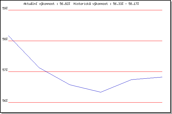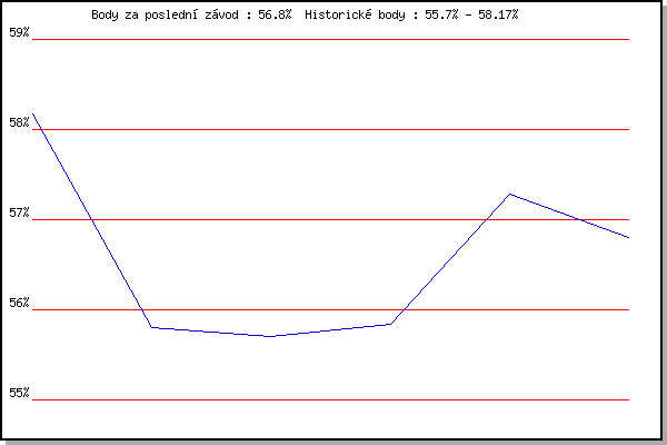 Závod| Body | Výkonnost | Změna | 26.04.2017 | Pisárky Anthropos, 6 km | 58.17% | 58.17% | | 10.05.2017 | Popůvky, 7.9 km | 55.80% | 57.13% | -1.04% | 17.05.2017 | Palackého vrch, 7.1 km | 55.70% | 56.57% | -0.56% | 13.09.2017 | Pisárky Anthropos, 6 km | 55.84% | 56.33% | -0.24% | 02.05.2018 | Hotel Myslivna, 7 km | 57.28% | 56.74% | +0.41% | 30.05.2018 | Líšeň, 11 km | 56.80% | 56.82% | +0.08% | | |