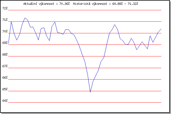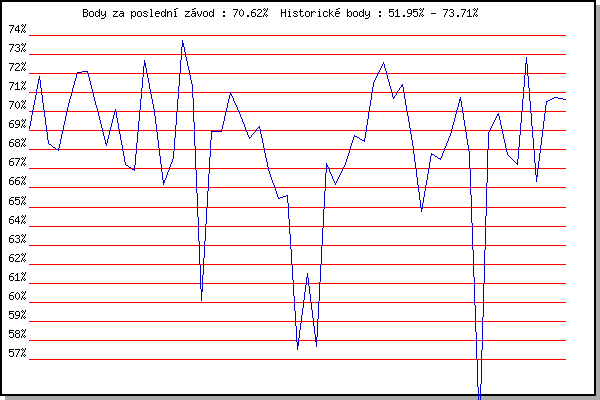 ZávodBodyVýkonnostZměna| 26.04.2017 | Pisárky Anthropos, 6 km | 69.11% | 69.11% | | | 03.05.2017 | Hotel Myslivna, 7 km | 71.83% | 71.01% | +1.90% | | 10.05.2017 | Popůvky, 7.9 km | 68.34% | 70.04% | -0.97% | | 17.05.2017 | Palackého vrch, 7.1 km | 67.99% | 69.40% | -0.64% | | 24.05.2017 | Obřany, 8.8 km | 70.39% | 69.88% | +0.48% | | 31.05.2017 | Líšeň, 11 km | 72.04% | 70.73% | +0.85% | | 07.06.2017 | Pisárky Anthropos, 6 km | 72.09% | 71.32% | +0.59% | | 21.06.2017 | Palackého vrch, 7.1 km | 70.25% | 71.15% | -0.17% | | 12.07.2017 | Atletický stadión Pod Palackého vrche | 68.23% | 70.51% | -0.64% | | 19.07.2017 | Pisárky Anthropos, 6 km | 70.11% | 70.53% | +0.02% | | 26.07.2017 | Palackého vrch, 7.1 km | 67.25% | 69.99% | -0.54% | | 02.08.2017 | Líšeň, 11 km | 66.90% | 69.41% | -0.58% | | 09.08.2017 | Hotel Myslivna, 7 km | 72.68% | 70.41% | +1.00% | | 16.08.2017 | Obřany, 8.8 km | 70.01% | 70.46% | +0.05% | | 23.08.2017 | Popůvky, 7.9 km | 66.18% | 69.76% | -0.70% | | 30.08.2017 | Atletický stadión Pod Palackého vrche | 67.58% | 69.35% | -0.41% | | 06.09.2017 | Líšeň, 11 km | 73.71% | 70.61% | +1.26% | | 13.09.2017 | Pisárky Anthropos, 6 km | 71.30% | 70.96% | +0.35% | | 25.04.2018 | Atletický stadión Pod Palackého vrche | 60.12% | 70.07% | -0.89% | | 02.05.2018 | Hotel Myslivna, 7 km | 68.97% | 70.01% | -0.06% | | 09.05.2018 | Popůvky, 7.9 km | 68.95% | 69.91% | -0.10% | | 16.05.2018 | Palackého vrch, 7.1 km | 71.00% | 70.31% | +0.40% | | 23.05.2018 | Obřany, 8.8 km | 69.82% | 70.32% | +0.01% | | 06.06.2018 | Pisárky Anthropos, 6 km | 68.62% | 69.99% | -0.33% | | 20.06.2018 | Palackého vrch, 7.1 km | 69.23% | 69.86% | -0.13% | | 11.07.2018 | Hotel Myslivna, 7 km | 66.97% | 69.43% | -0.43% | | 18.07.2018 | Obřany, 8.8 km | 65.43% | 68.87% | -0.56% | | 25.07.2018 | Líšeň, 11 km | 65.60% | 68.23% | -0.64% | | 01.08.2018 | Pisárky Anthropos, 6 km | 57.53% | 67.55% | -0.68% | | 08.08.2018 | Hotel Myslivna, 7 km | 61.53% | 66.42% | -1.13% | | 15.08.2018 | Popůvky, 7.9 km | 57.69% | 64.88% | -1.54% | | 22.08.2018 | Palackého vrch, 7.1 km | 67.26% | 65.82% | +0.94% | | 05.09.2018 | Obřany, 8.8 km | 66.20% | 66.29% | +0.47% | | 17.04.2019 | Atletický stadión Pod Palackého vrche | 67.30% | 66.82% | +0.53% | | 24.04.2019 | Pisárky Anthropos, 6 km | 68.77% | 67.56% | +0.74% | | 15.05.2019 | Kociánka, 3.2 km | 68.42% | 67.90% | +0.34% | | 22.05.2019 | Obřany, 8.8 km | 71.47% | 68.91% | +1.01% | | 29.05.2019 | Líšeň, 11 km | 72.59% | 69.98% | +1.07% | | 05.06.2019 | Palackého vrch, 7.1 km | 70.69% | 70.31% | +0.33% | | 19.06.2019 | Atletický stadión Pod Palackého vrche | 71.45% | 70.74% | +0.43% | | 03.07.2019 | Obřany, 8.8 km | 68.37% | 70.31% | -0.43% | | 10.07.2019 | Hotel Myslivna, 7 km | 64.78% | 69.53% | -0.78% | | 17.07.2019 | Palackého vrch, 7.1 km | 67.82% | 69.33% | -0.20% | | 24.07.2019 | Líšeň, 11 km | 67.48% | 69.01% | -0.32% | | 31.07.2019 | Popůvky, 7.9 km | 68.83% | 69.04% | +0.03% | | 07.08.2019 | Hotel Myslivna, 7 km | 70.76% | 69.56% | +0.52% | | 14.08.2019 | Palackého vrch, 7.1 km | 67.77% | 69.22% | -0.34% | | 11.09.2019 | Pisárky Anthropos, 6 km | 51.95% | 68.56% | -0.66% | | 01.07.2020 | Atletický stadión Pod Palackého vrche | 68.90% | 68.89% | +0.33% | | 08.07.2020 | Pisárky Anthropos, 6 km | 69.88% | 69.25% | +0.36% | | 15.07.2020 | Obřany, 8.8 km | 67.77% | 68.97% | -0.28% | | 22.07.2020 | Kociánka, 2.7 km | 67.22% | 68.64% | -0.33% | | 29.07.2020 | Hotel Myslivna, 7 km | 72.82% | 69.78% | +1.14% | | 12.08.2020 | Palackého vrch, 7.1 km | 66.32% | 69.20% | -0.58% | | 19.08.2020 | Obřany, 8.8 km | 70.55% | 69.68% | +0.48% | | 26.08.2020 | Atletický stadión Pod Palackého vrche | 70.77% | 70.09% | +0.41% | | 09.09.2020 | Pisárky Anthropos, 6 km | 70.62% | 70.36% | +0.27% | | | | |
