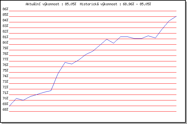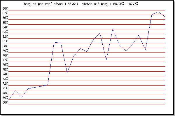 ZávodBodyVýkonnostZměna| 26.04.2017 | Pisárky Anthropos, 6 km | 68.95% | 68.96% | | | 03.05.2017 | Hotel Myslivna, 7 km | 70.91% | 70.31% | +1.35% | | 07.06.2017 | Pisárky Anthropos, 6 km | 69.47% | 70.02% | -0.29% | | 14.06.2017 | Popůvky, 7.9 km | 71.34% | 70.65% | +0.63% | | 28.06.2017 | Obřany, 8.8 km | 71.56% | 71.08% | +0.43% | | 05.09.2018 | Obřany, 8.8 km | 71.81% | 71.44% | +0.36% | | 12.09.2018 | Pisárky Anthropos, 6 km | 72.16% | 71.73% | +0.29% | | 17.04.2019 | Atletický stadión Pod Palackého vrche | 81.21% | 74.75% | +3.02% | | 24.04.2019 | Pisárky Anthropos, 6 km | 81.00% | 76.79% | +2.04% | | 29.05.2019 | Líšeň, 11 km | 74.75% | 76.52% | -0.27% | | 05.06.2019 | Palackého vrch, 7.1 km | 78.16% | 77.23% | +0.71% | | 12.06.2019 | Popůvky, 7.9 km | 79.90% | 78.23% | +1.00% | | 26.06.2019 | Pisárky Anthropos, 6 km | 79.20% | 78.80% | +0.57% | | 10.07.2019 | Hotel Myslivna, 7 km | 81.71% | 79.82% | +1.02% | | 24.07.2019 | Líšeň, 11 km | 83.14% | 80.94% | +1.12% | | 31.07.2019 | Popůvky, 7.9 km | 77.39% | 80.24% | -0.70% | | 07.08.2019 | Hotel Myslivna, 7 km | 84.05% | 81.37% | +1.13% | | 14.08.2019 | Palackého vrch, 7.1 km | 80.61% | 81.38% | +0.01% | | 21.08.2019 | Atletický stadión Pod Palackého vrche | 79.38% | 81.06% | -0.32% | | 28.08.2019 | Obřany, 8.8 km | 80.69% | 81.08% | +0.02% | | 04.09.2019 | Hotel Myslivna, 7 km | 82.66% | 81.57% | +0.49% | | 11.09.2019 | Pisárky Anthropos, 6 km | 79.58% | 81.18% | -0.39% | | 29.07.2020 | Hotel Myslivna, 7 km | 87.09% | 82.79% | +1.61% | | 05.08.2020 | Popůvky, 7.9 km | 87.70% | 84.21% | +1.42% | | 12.08.2020 | Palackého vrch, 7.1 km | 86.64% | 85.05% | +0.84% | | | | |