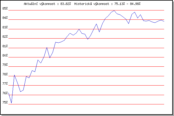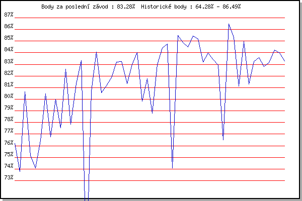 ZávodBodyVýkonnostZměna| 10.05.2017 | Popůvky, 7.9 km | 76.20% | 76.20% | | | 17.05.2017 | Palackého vrch, 7.1 km | 73.78% | 75.13% | -1.07% | | 24.05.2017 | Obřany, 8.8 km | 80.63% | 78.13% | +3.00% | | 31.05.2017 | Líšeň, 11 km | 75.16% | 77.25% | -0.88% | | 07.06.2017 | Pisárky Anthropos, 6 km | 74.10% | 76.33% | -0.92% | | 19.07.2017 | Pisárky Anthropos, 6 km | 76.47% | 76.52% | +0.19% | | 09.08.2017 | Hotel Myslivna, 7 km | 80.49% | 77.95% | +1.43% | | 25.04.2018 | Atletický stadión Pod Palackého vrche | 76.78% | 77.81% | -0.14% | | 09.05.2018 | Popůvky, 7.9 km | 79.99% | 78.59% | +0.78% | | 16.05.2018 | Palackého vrch, 7.1 km | 77.52% | 78.45% | -0.14% | | 30.05.2018 | Líšeň, 11 km | 82.61% | 79.71% | +1.26% | | 06.06.2018 | Pisárky Anthropos, 6 km | 77.83% | 79.37% | -0.34% | | 13.06.2018 | Atletický stadión Pod Palackého vrche | 81.33% | 80.02% | +0.65% | | 20.06.2018 | Palackého vrch, 7.1 km | 83.34% | 81.04% | +1.02% | | 27.06.2018 | Popůvky, 7.9 km | 64.28% | 79.94% | -1.10% | | 11.07.2018 | Hotel Myslivna, 7 km | 80.71% | 80.48% | +0.54% | | 18.07.2018 | Obřany, 8.8 km | 84.05% | 81.61% | +1.13% | | 25.07.2018 | Líšeň, 11 km | 80.55% | 81.55% | -0.06% | | 01.08.2018 | Pisárky Anthropos, 6 km | 81.16% | 81.64% | +0.09% | | 08.08.2018 | Hotel Myslivna, 7 km | 81.86% | 81.78% | +0.14% | | 15.08.2018 | Popůvky, 7.9 km | 83.21% | 82.21% | +0.43% | | 22.08.2018 | Palackého vrch, 7.1 km | 83.24% | 82.55% | +0.34% | | 29.08.2018 | Atletický stadión Pod Palackého vrche | 81.35% | 82.34% | -0.21% | | 05.09.2018 | Obřany, 8.8 km | 82.98% | 82.57% | +0.23% | | 12.09.2018 | Pisárky Anthropos, 6 km | 84.02% | 83.00% | +0.43% | | 17.04.2019 | Atletický stadión Pod Palackého vrche | 79.84% | 82.52% | -0.48% | | 24.04.2019 | Pisárky Anthropos, 6 km | 81.79% | 82.47% | -0.05% | | 15.05.2019 | Kociánka, 3.2 km | 78.81% | 81.91% | -0.56% | | 05.06.2019 | Palackého vrch, 7.1 km | 82.97% | 82.31% | +0.40% | | 12.06.2019 | Popůvky, 7.9 km | 84.39% | 82.96% | +0.65% | | 19.06.2019 | Atletický stadión Pod Palackého vrche | 84.77% | 83.55% | +0.59% | | 26.06.2019 | Pisárky Anthropos, 6 km | 74.10% | 82.68% | -0.87% | | 03.07.2019 | Obřany, 8.8 km | 85.49% | 83.61% | +0.93% | | 10.07.2019 | Hotel Myslivna, 7 km | 84.87% | 84.14% | +0.53% | | 24.07.2019 | Líšeň, 11 km | 84.48% | 84.40% | +0.26% | | 31.07.2019 | Popůvky, 7.9 km | 85.45% | 84.79% | +0.39% | | 07.08.2019 | Hotel Myslivna, 7 km | 85.17% | 84.98% | +0.19% | | 14.08.2019 | Palackého vrch, 7.1 km | 83.19% | 84.62% | -0.36% | | 21.08.2019 | Atletický stadión Pod Palackého vrche | 83.96% | 84.53% | -0.09% | | 11.09.2019 | Pisárky Anthropos, 6 km | 83.43% | 84.32% | -0.21% | | 08.07.2020 | Pisárky Anthropos, 6 km | 82.94% | 84.07% | -0.25% | | 22.07.2020 | Kociánka, 2.7 km | 76.50% | 83.58% | -0.49% | | 29.07.2020 | Hotel Myslivna, 7 km | 86.49% | 84.56% | +0.98% | | 19.08.2020 | Obřany, 8.8 km | 85.30% | 84.82% | +0.26% | | 26.08.2020 | Atletický stadión Pod Palackého vrche | 81.14% | 84.17% | -0.65% | | 02.09.2020 | Líšeň, 11 km | 84.97% | 84.52% | +0.35% | | 09.06.2021 | Pisárky | 81.28% | 83.89% | -0.63% | | 16.06.2021 | Palackého vrch | 83.25% | 83.86% | -0.03% | | 23.06.2021 | Obřany | 83.59% | 83.92% | +0.06% | | 30.06.2021 | Líšeň | 82.81% | 83.77% | -0.15% | | 07.07.2021 | Pisárky | 83.17% | 83.68% | -0.09% | | 28.07.2021 | Palackého vrch | 84.22% | 83.86% | +0.18% | | 04.08.2021 | Pisárky | 83.96% | 83.94% | +0.08% | | 01.09.2021 | Obřany | 83.28% | 83.82% | -0.12% | | | | |