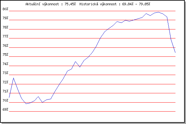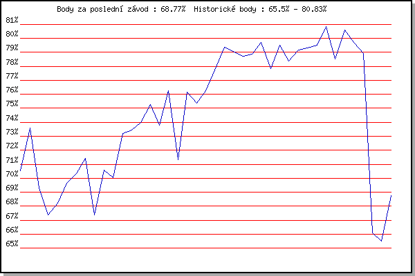 ZávodBodyVýkonnostZměna| 31.05.2017 | Líšeň, 11 km | 70.53% | 70.53% | | | 02.08.2017 | Líšeň, 11 km | 73.61% | 72.68% | +2.15% | | 06.09.2017 | Líšeň, 11 km | 69.28% | 71.49% | -1.19% | | 25.04.2018 | Atletický stadión Pod Palackého vrche | 67.36% | 70.43% | -1.06% | | 02.05.2018 | Hotel Myslivna, 7 km | 68.22% | 69.84% | -0.59% | | 09.05.2018 | Popůvky, 7.9 km | 69.62% | 69.91% | +0.07% | | 16.05.2018 | Palackého vrch, 7.1 km | 70.32% | 70.14% | +0.23% | | 23.05.2018 | Obřany, 8.8 km | 71.42% | 70.64% | +0.50% | | 30.05.2018 | Líšeň, 11 km | 67.38% | 69.98% | -0.66% | | 06.06.2018 | Pisárky Anthropos, 6 km | 70.56% | 70.29% | +0.31% | | 13.06.2018 | Atletický stadión Pod Palackého vrche | 70.02% | 70.36% | +0.07% | | 20.06.2018 | Palackého vrch, 7.1 km | 73.18% | 71.22% | +0.86% | | 27.06.2018 | Popůvky, 7.9 km | 73.44% | 71.91% | +0.69% | | 18.07.2018 | Obřany, 8.8 km | 73.98% | 72.56% | +0.65% | | 25.07.2018 | Líšeň, 11 km | 75.26% | 73.40% | +0.84% | | 08.08.2018 | Hotel Myslivna, 7 km | 73.81% | 73.66% | +0.26% | | 15.08.2018 | Popůvky, 7.9 km | 76.24% | 74.48% | +0.82% | | 29.08.2018 | Atletický stadión Pod Palackého vrche | 71.31% | 73.86% | -0.62% | | 05.09.2018 | Obřany, 8.8 km | 76.15% | 74.57% | +0.71% | | 12.09.2018 | Pisárky Anthropos, 6 km | 75.38% | 74.94% | +0.37% | | 17.04.2019 | Atletický stadión Pod Palackého vrche | 76.27% | 75.45% | +0.51% | | 24.04.2019 | Pisárky Anthropos, 6 km | 77.73% | 76.14% | +0.69% | | 15.05.2019 | Kociánka, 3.2 km | 79.37% | 77.08% | +0.94% | | 22.05.2019 | Obřany, 8.8 km | 79.07% | 77.72% | +0.64% | | 29.05.2019 | Líšeň, 11 km | 78.72% | 78.09% | +0.37% | | 05.06.2019 | Palackého vrch, 7.1 km | 78.86% | 78.41% | +0.32% | | 12.06.2019 | Popůvky, 7.9 km | 79.73% | 78.85% | +0.44% | | 19.06.2019 | Atletický stadión Pod Palackého vrche | 77.82% | 78.72% | -0.13% | | 26.06.2019 | Pisárky Anthropos, 6 km | 79.50% | 78.98% | +0.26% | | 10.07.2019 | Hotel Myslivna, 7 km | 78.37% | 78.89% | -0.09% | | 17.07.2019 | Palackého vrch, 7.1 km | 79.17% | 79.01% | +0.12% | | 24.07.2019 | Líšeň, 11 km | 79.32% | 79.14% | +0.13% | | 31.07.2019 | Popůvky, 7.9 km | 79.50% | 79.27% | +0.13% | | 07.08.2019 | Hotel Myslivna, 7 km | 80.83% | 79.71% | +0.44% | | 14.08.2019 | Palackého vrch, 7.1 km | 78.55% | 79.48% | -0.23% | | 28.08.2019 | Obřany, 8.8 km | 80.62% | 79.81% | +0.33% | | 04.09.2019 | Hotel Myslivna, 7 km | 79.71% | 79.85% | +0.04% | | 11.09.2019 | Pisárky Anthropos, 6 km | 78.93% | 79.68% | -0.17% | | 22.07.2020 | Kociánka, 2.7 km | 66.10% | 79.35% | -0.33% | | 29.07.2020 | Hotel Myslivna, 7 km | 65.50% | 76.88% | -2.47% | | 12.08.2020 | Palackého vrch, 7.1 km | 68.77% | 75.45% | -1.43% | | | | |