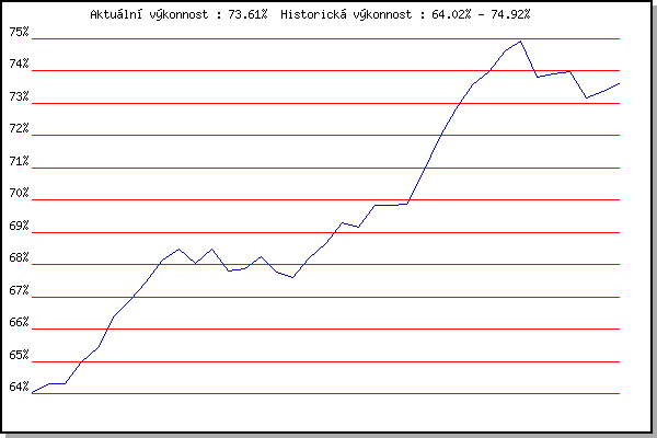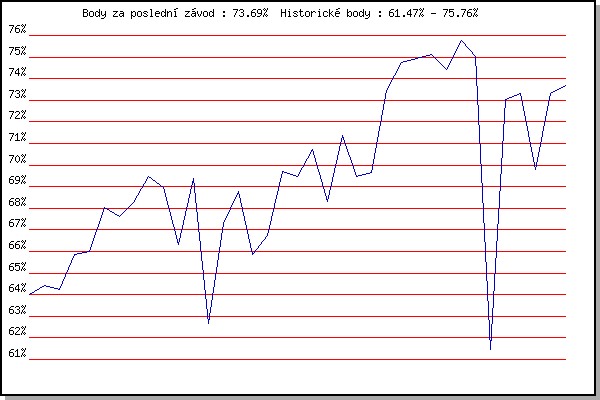 ZávodBodyVýkonnostZměna| 16.08.2017 | Obřany, 8.8 km | 64.01% | 64.02% | | | 23.05.2018 | Obřany, 8.8 km | 64.44% | 64.31% | +0.29% | | 06.06.2018 | Pisárky Anthropos, 6 km | 64.23% | 64.30% | -0.01% | | 11.07.2018 | Hotel Myslivna, 7 km | 65.86% | 64.98% | +0.68% | | 18.07.2018 | Obřany, 8.8 km | 66.02% | 65.43% | +0.45% | | 01.08.2018 | Pisárky Anthropos, 6 km | 68.04% | 66.40% | +0.97% | | 08.08.2018 | Hotel Myslivna, 7 km | 67.60% | 66.91% | +0.51% | | 15.08.2018 | Popůvky, 7.9 km | 68.28% | 67.45% | +0.54% | | 05.09.2018 | Obřany, 8.8 km | 69.49% | 68.14% | +0.69% | | 12.09.2018 | Pisárky Anthropos, 6 km | 68.95% | 68.48% | +0.34% | | 17.04.2019 | Atletický stadión Pod Palackého vrche | 66.31% | 68.03% | -0.45% | | 15.05.2019 | Kociánka, 3.2 km | 69.40% | 68.49% | +0.46% | | 19.06.2019 | Atletický stadión Pod Palackého vrche | 62.66% | 67.82% | -0.67% | | 26.06.2019 | Pisárky Anthropos, 6 km | 67.28% | 67.88% | +0.06% | | 03.07.2019 | Obřany, 8.8 km | 68.80% | 68.23% | +0.35% | | 10.07.2019 | Hotel Myslivna, 7 km | 65.86% | 67.76% | -0.47% | | 17.07.2019 | Palackého vrch, 7.1 km | 66.74% | 67.59% | -0.17% | | 31.07.2019 | Popůvky, 7.9 km | 69.69% | 68.22% | +0.63% | | 07.08.2019 | Hotel Myslivna, 7 km | 69.48% | 68.65% | +0.43% | | 14.08.2019 | Palackého vrch, 7.1 km | 70.71% | 69.28% | +0.63% | | 21.08.2019 | Atletický stadión Pod Palackého vrche | 68.32% | 69.17% | -0.11% | | 28.08.2019 | Obřany, 8.8 km | 71.39% | 69.84% | +0.67% | | 04.09.2019 | Hotel Myslivna, 7 km | 69.46% | 69.84% | 0.00% | | 11.09.2019 | Pisárky Anthropos, 6 km | 69.65% | 69.86% | +0.02% | | 01.07.2020 | Atletický stadión Pod Palackého vrche | 73.47% | 70.87% | +1.01% | | 08.07.2020 | Pisárky Anthropos, 6 km | 74.74% | 71.94% | +1.07% | | 15.07.2020 | Obřany, 8.8 km | 74.94% | 72.83% | +0.89% | | 22.07.2020 | Kociánka, 2.7 km | 75.14% | 73.58% | +0.75% | | 29.07.2020 | Hotel Myslivna, 7 km | 74.41% | 73.98% | +0.40% | | 05.08.2020 | Popůvky, 7.9 km | 75.76% | 74.64% | +0.66% | | 12.08.2020 | Palackého vrch, 7.1 km | 75.03% | 74.92% | +0.28% | | 02.09.2020 | Líšeň, 11 km | 61.47% | 73.80% | -1.12% | | 09.09.2020 | Pisárky Anthropos, 6 km | 73.03% | 73.92% | +0.12% | | 16.09.2020 | Atletický stadión Pod Palackého vrche | 73.30% | 73.97% | +0.05% | | 04.08.2021 | Pisárky | 69.78% | 73.16% | -0.81% | | 01.09.2021 | Obřany | 73.30% | 73.36% | +0.20% | | 15.09.2021 | Pod Palackého vrchem 5 km | 73.69% | 73.61% | +0.25% | | | | |
