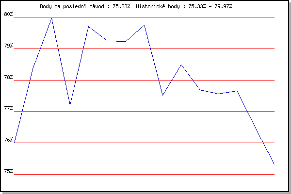 ZávodBodyVýkonnostZměna| 18.05.2011 | Palackého vrch, 7.1 km | 76.00% | 76.00% | | | 25.05.2011 | Obřany, 8.8 km | 78.40% | 77.67% | +1.67% | | 01.06.2011 | Líšeň Mariánské údolí, 11.1 km | 79.97% | 79.03% | +1.36% | | 08.06.2011 | Veselka, Popůvky Vintrovna, 7.9 km | 77.20% | 78.47% | -0.56% | | 15.06.2011 | Pisárky Anthropos, 6 km | 79.70% | 79.03% | +0.56% | | 23.06.2011 | Palackého vrch – Běh Olympijského dne | 79.24% | 79.22% | +0.19% | | 29.06.2011 | Obřany, 8.8 km | 79.23% | 79.34% | +0.12% | | 13.07.2011 | Popůvky, 7.9 km | 79.75% | 79.52% | +0.18% | | 27.07.2011 | Pisárky Anthropos, 6 km | 77.52% | 79.11% | -0.41% | | 10.08.2011 | Obřany, 8.8 km | 78.48% | 79.02% | -0.09% | | 17.08.2011 | AC Moravská Slávia, 10km atletický | 77.69% | 78.74% | -0.28% | | 31.08.2011 | Popůvky, 7.9 km | 77.56% | 78.49% | -0.25% | | 07.09.2011 | Pisárky Anthropos, 6 km | 77.66% | 78.32% | -0.17% | | 21.09.2011 | AC Moravská Slávia Brno, 1hod atlet | 76.48% | 78.12% | -0.20% | | 28.09.2011 | Blažovice – Svatováclavský běh , 11 k | 75.33% | 77.77% | -0.35% | | | | |