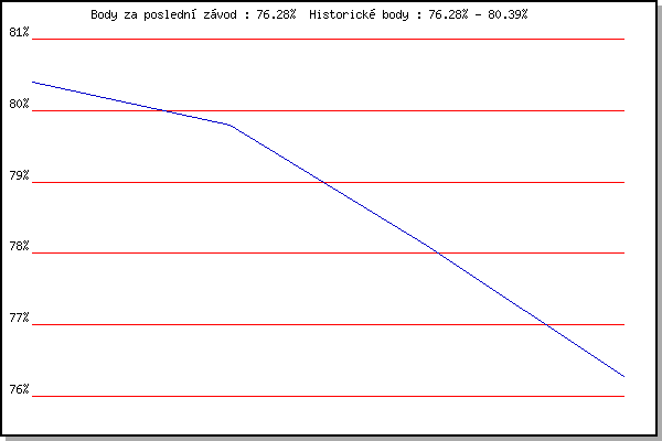 Závod| Body | Výkonnost | Změna | 10.08.2016 | Hotel Myslivna, 7 km | 80.39% | 80.39% | | 09.08.2017 | Hotel Myslivna, 7 km | 79.79% | 80.12% | -0.27% | 15.08.2018 | Popůvky, 7.9 km | 78.11% | 79.56% | -0.56% | 14.08.2019 | Palackého vrch, 7.1 km | 76.28% | 78.76% | -0.80% | | |
