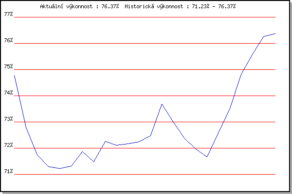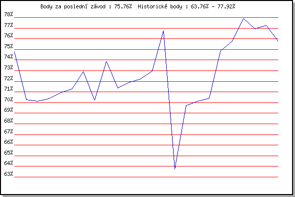 ZávodBodyVýkonnostZměna| 07.09.2016 | Pisárky Anthropos, 6 km | 74.77% | 74.77% | | | 26.04.2017 | Pisárky Anthropos, 6 km | 70.25% | 72.79% | -1.98% | | 03.05.2017 | Hotel Myslivna, 7 km | 70.14% | 71.74% | -1.05% | | 10.05.2017 | Popůvky, 7.9 km | 70.35% | 71.29% | -0.45% | | 17.05.2017 | Palackého vrch, 7.1 km | 70.91% | 71.23% | -0.06% | | 07.06.2017 | Pisárky Anthropos, 6 km | 71.29% | 71.32% | +0.09% | | 14.06.2017 | Popůvky, 7.9 km | 72.89% | 71.88% | +0.56% | | 21.06.2017 | Palackého vrch, 7.1 km | 70.21% | 71.49% | -0.39% | | 28.06.2017 | Obřany, 8.8 km | 73.86% | 72.26% | +0.77% | | 12.07.2017 | Atletický stadión Pod Palackého vrche | 71.38% | 72.12% | -0.14% | | 26.07.2017 | Palackého vrch, 7.1 km | 71.90% | 72.16% | +0.04% | | 09.08.2017 | Hotel Myslivna, 7 km | 72.20% | 72.25% | +0.09% | | 16.08.2017 | Obřany, 8.8 km | 72.94% | 72.49% | +0.24% | | 13.09.2017 | Pisárky Anthropos, 6 km | 76.74% | 73.69% | +1.20% | | 16.05.2018 | Palackého vrch, 7.1 km | 63.76% | 73.01% | -0.68% | | 23.05.2018 | Obřany, 8.8 km | 69.73% | 72.39% | -0.62% | | 06.06.2018 | Pisárky Anthropos, 6 km | 70.15% | 71.96% | -0.43% | | 11.07.2018 | Hotel Myslivna, 7 km | 70.39% | 71.67% | -0.29% | | 17.04.2019 | Atletický stadión Pod Palackého vrche | 74.85% | 72.58% | +0.91% | | 24.04.2019 | Pisárky Anthropos, 6 km | 75.77% | 73.52% | +0.94% | | 15.05.2019 | Kociánka, 3.2 km | 77.92% | 74.82% | +1.30% | | 12.06.2019 | Popůvky, 7.9 km | 76.94% | 75.58% | +0.76% | | 03.07.2019 | Obřany, 8.8 km | 77.27% | 76.26% | +0.68% | | 10.07.2019 | Hotel Myslivna, 7 km | 75.76% | 76.37% | +0.11% | | | | |