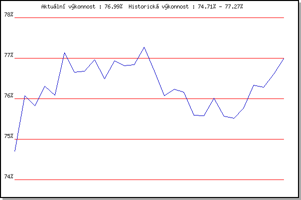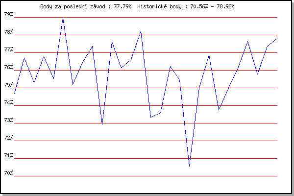 ZávodBodyVýkonnostZměna| 25.04.2018 | Atletický stadión Pod Palackého vrche | 74.70% | 74.71% | | | 02.05.2018 | Hotel Myslivna, 7 km | 76.68% | 76.08% | +1.37% | | 09.05.2018 | Popůvky, 7.9 km | 75.31% | 75.83% | -0.25% | | 23.05.2018 | Obřany, 8.8 km | 76.78% | 76.31% | +0.48% | | 30.05.2018 | Líšeň, 11 km | 75.52% | 76.09% | -0.22% | | 06.06.2018 | Pisárky Anthropos, 6 km | 78.98% | 77.13% | +1.04% | | 13.06.2018 | Atletický stadión Pod Palackého vrche | 75.20% | 76.66% | -0.47% | | 20.06.2018 | Palackého vrch, 7.1 km | 76.44% | 76.68% | +0.02% | | 27.06.2018 | Popůvky, 7.9 km | 77.36% | 76.96% | +0.28% | | 18.07.2018 | Obřany, 8.8 km | 72.93% | 76.49% | -0.47% | | 25.07.2018 | Líšeň, 11 km | 77.62% | 76.94% | +0.45% | | 01.08.2018 | Pisárky Anthropos, 6 km | 76.15% | 76.82% | -0.12% | | 15.08.2018 | Popůvky, 7.9 km | 76.62% | 76.84% | +0.02% | | 22.08.2018 | Palackého vrch, 7.1 km | 78.21% | 77.27% | +0.43% | | 05.09.2018 | Obřany, 8.8 km | 73.33% | 76.69% | -0.58% | | 17.04.2019 | Atletický stadión Pod Palackého vrche | 73.57% | 76.07% | -0.62% | | 24.04.2019 | Pisárky Anthropos, 6 km | 76.21% | 76.24% | +0.17% | | 22.05.2019 | Obřany, 8.8 km | 75.44% | 76.16% | -0.08% | | 19.06.2019 | Atletický stadión Pod Palackého vrche | 70.56% | 75.59% | -0.57% | | 10.07.2019 | Hotel Myslivna, 7 km | 75.01% | 75.58% | -0.01% | | 07.08.2019 | Hotel Myslivna, 7 km | 76.85% | 76.01% | +0.43% | | 14.08.2019 | Palackého vrch, 7.1 km | 73.76% | 75.57% | -0.44% | | 04.09.2019 | Hotel Myslivna, 7 km | 75.00% | 75.52% | -0.05% | | 29.07.2020 | Hotel Myslivna, 7 km | 76.11% | 75.76% | +0.24% | | 05.08.2020 | Popůvky, 7.9 km | 77.64% | 76.33% | +0.57% | | 12.08.2020 | Palackého vrch, 7.1 km | 75.79% | 76.28% | -0.05% | | 19.08.2020 | Obřany, 8.8 km | 77.35% | 76.61% | +0.33% | | 09.09.2020 | Pisárky Anthropos, 6 km | 77.79% | 76.99% | +0.38% | | | | |