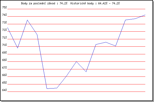 ZávodBodyVýkonnostZměna| 25.04.2018 | Atletický stadión Pod Palackého vrche | 72.52% | 72.52% | | | 02.05.2018 | Hotel Myslivna, 7 km | 69.82% | 71.34% | -1.18% | | 09.05.2018 | Popůvky, 7.9 km | 73.54% | 72.62% | +1.28% | | 16.05.2018 | Palackého vrch, 7.1 km | 71.62% | 72.44% | -0.18% | | 18.07.2018 | Obřany, 8.8 km | 64.42% | 71.05% | -1.39% | | 25.07.2018 | Líšeň, 11 km | 64.47% | 69.33% | -1.72% | | 01.08.2018 | Pisárky Anthropos, 6 km | 66.12% | 68.63% | -0.70% | | 15.08.2018 | Popůvky, 7.9 km | 68.00% | 68.69% | +0.06% | | 22.08.2018 | Palackého vrch, 7.1 km | 66.66% | 68.34% | -0.35% | | 29.08.2018 | Atletický stadión Pod Palackého vrche | 70.27% | 69.03% | +0.69% | | 05.09.2018 | Obřany, 8.8 km | 70.58% | 69.61% | +0.58% | | 12.09.2018 | Pisárky Anthropos, 6 km | 70.09% | 69.91% | +0.30% | | 03.07.2019 | Obřany, 8.8 km | 73.54% | 71.05% | +1.14% | | 24.07.2019 | Líšeň, 11 km | 73.72% | 71.94% | +0.89% | | 11.09.2019 | Pisárky Anthropos, 6 km | 74.20% | 72.68% | +0.74% | | | | |