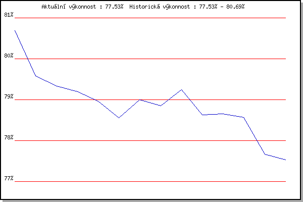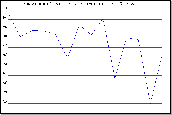 ZávodBodyVýkonnostZměna| 02.05.2018 | Hotel Myslivna, 7 km | 80.69% | 80.69% | | | 09.05.2018 | Popůvky, 7.9 km | 78.17% | 79.58% | -1.11% | | 16.05.2018 | Palackého vrch, 7.1 km | 78.82% | 79.33% | -0.25% | | 23.05.2018 | Obřany, 8.8 km | 78.79% | 79.20% | -0.13% | | 30.05.2018 | Líšeň, 11 km | 78.38% | 78.96% | -0.24% | | 13.06.2018 | Atletický stadión Pod Palackého vrche | 75.86% | 78.56% | -0.40% | | 27.06.2018 | Popůvky, 7.9 km | 79.42% | 79.00% | +0.44% | | 11.07.2018 | Hotel Myslivna, 7 km | 78.33% | 78.85% | -0.15% | | 18.07.2018 | Obřany, 8.8 km | 80.11% | 79.25% | +0.40% | | 25.07.2018 | Líšeň, 11 km | 73.68% | 78.63% | -0.62% | | 01.08.2018 | Pisárky Anthropos, 6 km | 78.04% | 78.66% | +0.03% | | 22.08.2018 | Palackého vrch, 7.1 km | 77.85% | 78.57% | -0.09% | | 29.08.2018 | Atletický stadión Pod Palackého vrche | 71.01% | 77.67% | -0.90% | | 05.09.2018 | Obřany, 8.8 km | 76.22% | 77.53% | -0.14% | | | | |