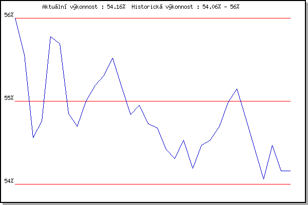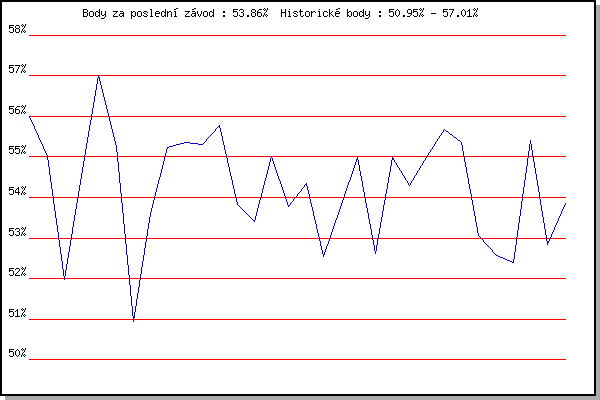 ZávodBodyVýkonnostZměna| 25.04.2018 | Atletický stadión Pod Palackého vrche | 56.00% | 56.00% | | | 02.05.2018 | Hotel Myslivna, 7 km | 55.00% | 55.56% | -0.44% | | 09.05.2018 | Popůvky, 7.9 km | 51.98% | 54.56% | -1.00% | | 16.05.2018 | Palackého vrch, 7.1 km | 54.54% | 54.76% | +0.20% | | 23.05.2018 | Obřany, 8.8 km | 57.01% | 55.78% | +1.02% | | 06.06.2018 | Pisárky Anthropos, 6 km | 55.26% | 55.69% | -0.09% | | 18.07.2018 | Obřany, 8.8 km | 50.95% | 54.85% | -0.84% | | 12.09.2018 | Pisárky Anthropos, 6 km | 53.60% | 54.70% | -0.15% | | 17.04.2019 | Atletický stadión Pod Palackého vrche | 55.23% | 55.00% | +0.30% | | 24.04.2019 | Pisárky Anthropos, 6 km | 55.35% | 55.19% | +0.19% | | 29.05.2019 | Líšeň, 11 km | 55.32% | 55.31% | +0.12% | | 05.06.2019 | Palackého vrch, 7.1 km | 55.77% | 55.52% | +0.21% | | 12.06.2019 | Popůvky, 7.9 km | 53.82% | 55.16% | -0.36% | | 19.06.2019 | Atletický stadión Pod Palackého vrche | 53.42% | 54.84% | -0.32% | | 26.06.2019 | Pisárky Anthropos, 6 km | 55.02% | 54.95% | +0.11% | | 17.07.2019 | Palackého vrch, 7.1 km | 53.78% | 54.73% | -0.22% | | 24.07.2019 | Líšeň, 11 km | 54.34% | 54.68% | -0.05% | | 31.07.2019 | Popůvky, 7.9 km | 52.54% | 54.42% | -0.26% | | 07.08.2019 | Hotel Myslivna, 7 km | 53.75% | 54.31% | -0.11% | | 28.08.2019 | Obřany, 8.8 km | 54.99% | 54.53% | +0.22% | | 04.09.2019 | Hotel Myslivna, 7 km | 52.61% | 54.19% | -0.34% | | 11.09.2019 | Pisárky Anthropos, 6 km | 54.99% | 54.47% | +0.28% | | 01.07.2020 | Atletický stadión Pod Palackého vrche | 54.30% | 54.53% | +0.06% | | 08.07.2020 | Pisárky Anthropos, 6 km | 55.03% | 54.70% | +0.17% | | 15.07.2020 | Obřany, 8.8 km | 55.67% | 54.99% | +0.29% | | 22.07.2020 | Kociánka, 2.7 km | 55.36% | 55.15% | +0.16% | | 29.07.2020 | Hotel Myslivna, 7 km | 53.07% | 54.80% | -0.35% | | 05.08.2020 | Popůvky, 7.9 km | 52.57% | 54.42% | -0.38% | | 12.08.2020 | Palackého vrch, 7.1 km | 52.40% | 54.06% | -0.36% | | 19.08.2020 | Obřany, 8.8 km | 55.40% | 54.47% | +0.41% | | 02.09.2020 | Líšeň, 11 km | 52.83% | 54.16% | -0.31% | | 09.09.2020 | Pisárky Anthropos, 6 km | 53.86% | 54.16% | 0.00% | | | | |