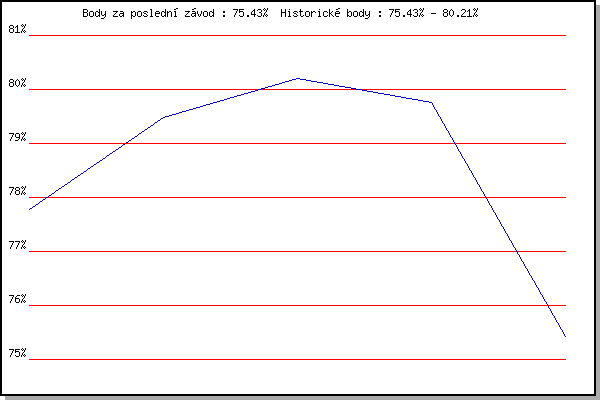 Závod| Body | Výkonnost | Změna | 25.04.2018 | Atletický stadión Pod Palackého vrche | 77.77% | 77.78% | | 09.05.2018 | Popůvky, 7.9 km | 79.48% | 78.97% | +1.19% | 16.05.2018 | Palackého vrch, 7.1 km | 80.21% | 79.72% | +0.75% | 23.05.2018 | Obřany, 8.8 km | 79.76% | 79.84% | +0.12% | 15.05.2019 | Kociánka, 3.2 km | 75.43% | 79.00% | -0.84% | | |