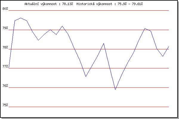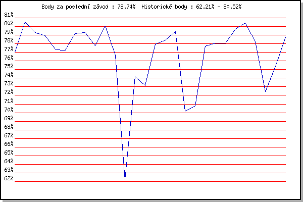 ZávodBodyVýkonnostZměna| 25.04.2018 | Atletický stadión Pod Palackého vrche | 77.03% | 77.03% | | | 16.05.2018 | Palackého vrch, 7.1 km | 80.52% | 79.47% | +2.44% | | 30.05.2018 | Líšeň, 11 km | 79.27% | 79.61% | +0.14% | | 06.06.2018 | Pisárky Anthropos, 6 km | 78.93% | 79.48% | -0.13% | | 13.06.2018 | Atletický stadión Pod Palackého vrche | 77.38% | 78.89% | -0.59% | | 11.07.2018 | Hotel Myslivna, 7 km | 77.21% | 78.45% | -0.44% | | 18.07.2018 | Obřany, 8.8 km | 79.20% | 78.77% | +0.32% | | 15.08.2018 | Popůvky, 7.9 km | 79.27% | 79.01% | +0.24% | | 05.09.2018 | Obřany, 8.8 km | 77.79% | 78.75% | -0.26% | | 12.09.2018 | Pisárky Anthropos, 6 km | 80.08% | 79.20% | +0.45% | | 17.04.2019 | Atletický stadión Pod Palackého vrche | 76.64% | 78.77% | -0.43% | | 22.05.2019 | Obřany, 8.8 km | 62.21% | 78.08% | -0.69% | | 05.06.2019 | Palackého vrch, 7.1 km | 74.17% | 77.42% | -0.66% | | 12.06.2019 | Popůvky, 7.9 km | 73.14% | 76.58% | -0.84% | | 03.07.2019 | Obřany, 8.8 km | 77.95% | 77.11% | +0.53% | | 10.07.2019 | Hotel Myslivna, 7 km | 78.44% | 77.65% | +0.54% | | 17.07.2019 | Palackého vrch, 7.1 km | 79.43% | 78.30% | +0.65% | | 24.07.2019 | Líšeň, 11 km | 70.14% | 77.10% | -1.20% | | 07.08.2019 | Hotel Myslivna, 7 km | 70.82% | 75.90% | -1.20% | | 21.08.2019 | Atletický stadión Pod Palackého vrche | 77.71% | 76.62% | +0.72% | | 28.08.2019 | Obřany, 8.8 km | 78.04% | 77.25% | +0.63% | | 04.09.2019 | Hotel Myslivna, 7 km | 78.06% | 77.77% | +0.52% | | 11.09.2019 | Pisárky Anthropos, 6 km | 79.73% | 78.50% | +0.73% | | 01.07.2020 | Atletický stadión Pod Palackého vrche | 80.39% | 79.08% | +0.58% | | 08.07.2020 | Pisárky Anthropos, 6 km | 78.24% | 78.94% | -0.14% | | 02.06.2021 | Pod Palackého vrchem 10 km | 72.42% | 78.02% | -0.92% | | 16.06.2021 | Palackého vrch | 75.35% | 77.63% | -0.39% | | 30.06.2021 | Líšeň | 78.74% | 78.13% | +0.50% | | | | |