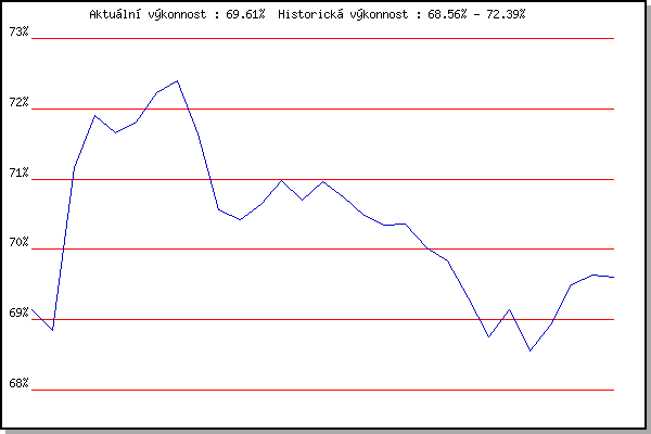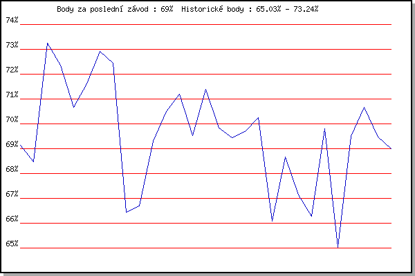ZávodBodyVýkonnostZměna| 25.04.2018 | Atletický stadión Pod Palackého vrche | 69.15% | 69.15% | | | 02.05.2018 | Hotel Myslivna, 7 km | 68.48% | 68.85% | -0.30% | | 09.05.2018 | Popůvky, 7.9 km | 73.24% | 71.17% | +2.32% | | 23.05.2018 | Obřany, 8.8 km | 72.36% | 71.90% | +0.73% | | 30.05.2018 | Líšeň, 11 km | 70.66% | 71.65% | -0.25% | | 06.06.2018 | Pisárky Anthropos, 6 km | 71.60% | 71.81% | +0.16% | | 13.06.2018 | Atletický stadión Pod Palackého vrche | 72.92% | 72.23% | +0.42% | | 27.06.2018 | Popůvky, 7.9 km | 72.44% | 72.39% | +0.16% | | 01.08.2018 | Pisárky Anthropos, 6 km | 66.44% | 71.64% | -0.75% | | 12.09.2018 | Pisárky Anthropos, 6 km | 66.69% | 70.56% | -1.08% | | 17.04.2019 | Atletický stadión Pod Palackého vrche | 69.30% | 70.43% | -0.13% | | 24.04.2019 | Pisárky Anthropos, 6 km | 70.50% | 70.64% | +0.21% | | 15.05.2019 | Kociánka, 3.2 km | 71.19% | 70.98% | +0.34% | | 22.05.2019 | Obřany, 8.8 km | 69.54% | 70.70% | -0.28% | | 29.05.2019 | Líšeň, 11 km | 71.40% | 70.96% | +0.26% | | 05.06.2019 | Palackého vrch, 7.1 km | 69.84% | 70.75% | -0.21% | | 12.06.2019 | Popůvky, 7.9 km | 69.44% | 70.48% | -0.27% | | 19.06.2019 | Atletický stadión Pod Palackého vrche | 69.70% | 70.34% | -0.14% | | 26.06.2019 | Pisárky Anthropos, 6 km | 70.25% | 70.36% | +0.02% | | 03.07.2019 | Obřany, 8.8 km | 66.09% | 70.02% | -0.34% | | 10.07.2019 | Hotel Myslivna, 7 km | 68.67% | 69.84% | -0.18% | | 17.07.2019 | Palackého vrch, 7.1 km | 67.14% | 69.31% | -0.53% | | 24.07.2019 | Líšeň, 11 km | 66.28% | 68.76% | -0.55% | | 31.07.2019 | Popůvky, 7.9 km | 69.80% | 69.14% | +0.38% | | 07.08.2019 | Hotel Myslivna, 7 km | 65.03% | 68.56% | -0.58% | | 14.08.2019 | Palackého vrch, 7.1 km | 69.49% | 68.92% | +0.36% | | 21.08.2019 | Atletický stadión Pod Palackého vrche | 70.67% | 69.49% | +0.57% | | 28.08.2019 | Obřany, 8.8 km | 69.46% | 69.64% | +0.15% | | 11.09.2019 | Pisárky Anthropos, 6 km | 69.00% | 69.61% | -0.03% | | | | |