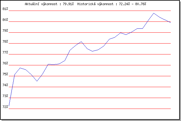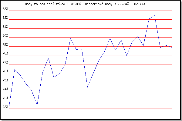 ZávodBodyVýkonnostZměna| 25.04.2018 | Atletický stadión Pod Palackého vrche | 72.24% | 72.24% | | | 02.05.2018 | Hotel Myslivna, 7 km | 76.40% | 75.15% | +2.91% | | 16.05.2018 | Palackého vrch, 7.1 km | 75.78% | 75.76% | +0.61% | | 23.05.2018 | Obřany, 8.8 km | 74.81% | 75.57% | -0.19% | | 30.05.2018 | Líšeň, 11 km | 74.08% | 75.15% | -0.42% | | 13.06.2018 | Atletický stadión Pod Palackého vrche | 72.44% | 74.54% | -0.61% | | 20.06.2018 | Palackého vrch, 7.1 km | 76.09% | 75.16% | +0.62% | | 11.07.2018 | Hotel Myslivna, 7 km | 77.69% | 76.09% | +0.93% | | 18.07.2018 | Obřany, 8.8 km | 75.52% | 76.05% | -0.04% | | 25.07.2018 | Líšeň, 11 km | 75.93% | 76.12% | +0.07% | | 01.08.2018 | Pisárky Anthropos, 6 km | 76.93% | 76.41% | +0.29% | | 08.08.2018 | Hotel Myslivna, 7 km | 79.86% | 77.40% | +0.99% | | 15.08.2018 | Popůvky, 7.9 km | 78.66% | 77.83% | +0.43% | | 22.08.2018 | Palackého vrch, 7.1 km | 78.72% | 78.17% | +0.34% | | 29.08.2018 | Atletický stadión Pod Palackého vrche | 74.41% | 77.54% | -0.63% | | 05.09.2018 | Obřany, 8.8 km | 75.89% | 77.27% | -0.27% | | 12.09.2018 | Pisárky Anthropos, 6 km | 77.41% | 77.42% | +0.15% | | 24.04.2019 | Pisárky Anthropos, 6 km | 78.35% | 77.74% | +0.32% | | 15.05.2019 | Kociánka, 3.2 km | 79.92% | 78.39% | +0.65% | | 22.05.2019 | Obřany, 8.8 km | 78.57% | 78.56% | +0.17% | | 29.05.2019 | Líšeň, 11 km | 79.70% | 78.96% | +0.40% | | 03.07.2019 | Obřany, 8.8 km | 77.99% | 78.80% | -0.16% | | 10.07.2019 | Hotel Myslivna, 7 km | 79.46% | 79.03% | +0.23% | | 17.07.2019 | Palackého vrch, 7.1 km | 80.12% | 79.35% | +0.32% | | 24.07.2019 | Líšeň, 11 km | 79.05% | 79.35% | 0.00% | | 07.08.2019 | Hotel Myslivna, 7 km | 82.08% | 80.10% | +0.75% | | 14.08.2019 | Palackého vrch, 7.1 km | 82.47% | 80.78% | +0.68% | | 21.08.2019 | Atletický stadión Pod Palackého vrche | 78.86% | 80.41% | -0.37% | | 04.09.2019 | Hotel Myslivna, 7 km | 79.13% | 80.16% | -0.25% | | 11.09.2019 | Pisárky Anthropos, 6 km | 78.88% | 79.91% | -0.25% | | | | |