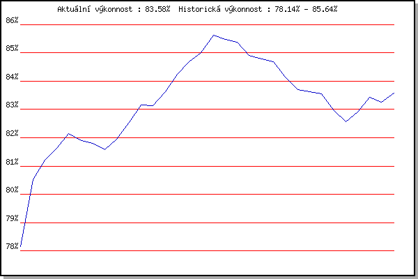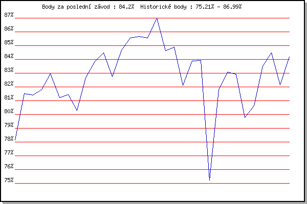 ZávodBodyVýkonnostZměna| 25.04.2018 | Atletický stadión Pod Palackého vrche | 78.14% | 78.14% | | | 02.05.2018 | Hotel Myslivna, 7 km | 81.53% | 80.51% | +2.37% | | 09.05.2018 | Popůvky, 7.9 km | 81.40% | 81.20% | +0.69% | | 16.05.2018 | Palackého vrch, 7.1 km | 81.83% | 81.62% | +0.42% | | 23.05.2018 | Obřany, 8.8 km | 82.97% | 82.14% | +0.52% | | 30.05.2018 | Líšeň, 11 km | 81.24% | 81.91% | -0.23% | | 06.06.2018 | Pisárky Anthropos, 6 km | 81.45% | 81.80% | -0.11% | | 13.06.2018 | Atletický stadión Pod Palackého vrche | 80.31% | 81.57% | -0.23% | | 20.06.2018 | Palackého vrch, 7.1 km | 82.68% | 81.96% | +0.39% | | 27.06.2018 | Popůvky, 7.9 km | 83.84% | 82.55% | +0.59% | | 11.07.2018 | Hotel Myslivna, 7 km | 84.49% | 83.16% | +0.61% | | 18.07.2018 | Obřany, 8.8 km | 82.73% | 83.14% | -0.02% | | 25.07.2018 | Líšeň, 11 km | 84.66% | 83.63% | +0.49% | | 08.08.2018 | Hotel Myslivna, 7 km | 85.56% | 84.24% | +0.61% | | 15.08.2018 | Popůvky, 7.9 km | 85.67% | 84.69% | +0.45% | | 22.08.2018 | Palackého vrch, 7.1 km | 85.54% | 85.01% | +0.32% | | 29.08.2018 | Atletický stadión Pod Palackého vrche | 86.99% | 85.64% | +0.63% | | 05.09.2018 | Obřany, 8.8 km | 84.64% | 85.49% | -0.15% | | 12.09.2018 | Pisárky Anthropos, 6 km | 84.87% | 85.39% | -0.10% | | 17.04.2019 | Atletický stadión Pod Palackého vrche | 82.12% | 84.91% | -0.48% | | 24.04.2019 | Pisárky Anthropos, 6 km | 83.89% | 84.79% | -0.12% | | 15.05.2019 | Kociánka, 3.2 km | 83.94% | 84.68% | -0.11% | | 22.05.2019 | Obřany, 8.8 km | 75.21% | 84.15% | -0.53% | | 05.06.2019 | Palackého vrch, 7.1 km | 81.79% | 83.71% | -0.44% | | 12.06.2019 | Popůvky, 7.9 km | 83.07% | 83.64% | -0.07% | | 24.07.2019 | Líšeň, 11 km | 82.93% | 83.56% | -0.08% | | 07.08.2019 | Hotel Myslivna, 7 km | 79.78% | 82.99% | -0.57% | | 14.08.2019 | Palackého vrch, 7.1 km | 80.64% | 82.57% | -0.42% | | 21.08.2019 | Atletický stadión Pod Palackého vrche | 83.51% | 82.92% | +0.35% | | 28.08.2019 | Obřany, 8.8 km | 84.47% | 83.43% | +0.51% | | 04.09.2019 | Hotel Myslivna, 7 km | 82.16% | 83.25% | -0.18% | | 11.09.2019 | Pisárky Anthropos, 6 km | 84.20% | 83.58% | +0.33% | | | | |