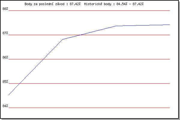 Závod| Body | Výkonnost | Změna | 23.05.2018 | Obřany, 8.8 km | 84.54% | 84.54% | | 20.06.2018 | Palackého vrch, 7.1 km | 86.81% | 86.12% | +1.58% | 27.06.2018 | Popůvky, 7.9 km | 87.37% | 86.92% | +0.80% | 18.07.2018 | Obřany, 8.8 km | 87.42% | 87.26% | +0.34% | | |