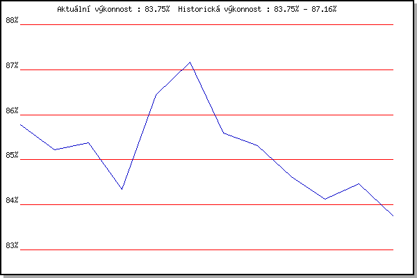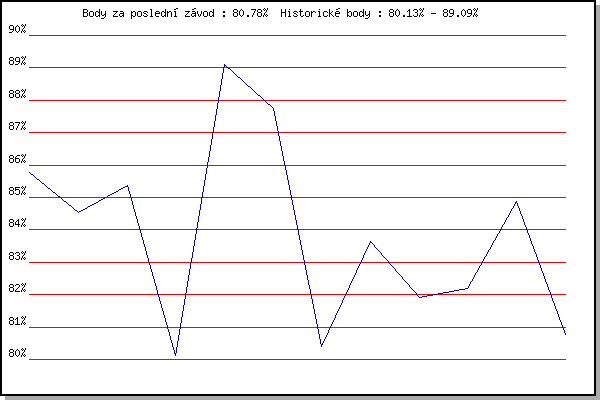 ZávodBodyVýkonnostZměna| 11.07.2018 | Hotel Myslivna, 7 km | 85.77% | 85.77% | | | 18.07.2018 | Obřany, 8.8 km | 84.54% | 85.22% | -0.55% | | 25.07.2018 | Líšeň, 11 km | 85.37% | 85.37% | +0.15% | | 01.08.2018 | Pisárky Anthropos, 6 km | 80.13% | 84.34% | -1.03% | | 08.08.2018 | Hotel Myslivna, 7 km | 89.09% | 86.44% | +2.10% | | 22.08.2018 | Palackého vrch, 7.1 km | 87.75% | 87.16% | +0.72% | | 21.08.2019 | Atletický stadión Pod Palackého vrche | 80.40% | 85.60% | -1.56% | | 01.07.2020 | Atletický stadión Pod Palackého vrche | 83.63% | 85.32% | -0.28% | | 08.07.2020 | Pisárky Anthropos, 6 km | 81.90% | 84.62% | -0.70% | | 30.06.2021 | Líšeň | 82.19% | 84.13% | -0.49% | | 14.07.2021 | Myslivna | 84.89% | 84.46% | +0.33% | | 25.08.2021 | Líšeň | 80.78% | 83.75% | -0.71% | | | | |