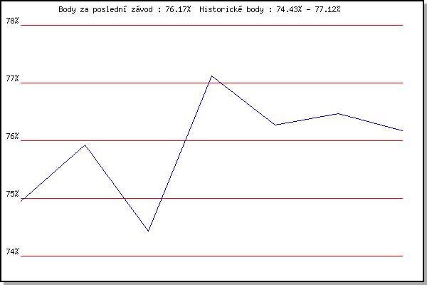 Závod| Body | Výkonnost | Změna | 25.07.2018 | Líšeň, 11 km | 74.95% | 74.95% | | 01.08.2018 | Pisárky Anthropos, 6 km | 75.92% | 75.62% | +0.67% | 08.08.2018 | Hotel Myslivna, 7 km | 74.43% | 75.21% | -0.41% | 22.08.2018 | Palackého vrch, 7.1 km | 77.12% | 76.09% | +0.88% | 17.04.2019 | Atletický stadión Pod Palackého vrche | 76.27% | 76.28% | +0.19% | 24.04.2019 | Pisárky Anthropos, 6 km | 76.47% | 76.43% | +0.15% | 05.06.2019 | Palackého vrch, 7.1 km | 76.17% | 76.40% | -0.03% | | |