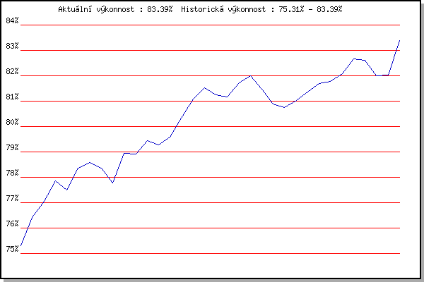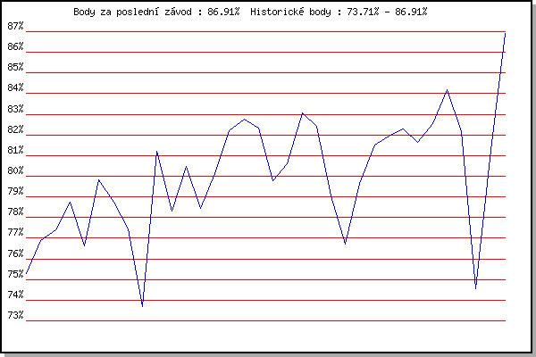 ZávodBodyVýkonnostZměna| 08.08.2018 | Hotel Myslivna, 7 km | 75.31% | 75.31% | | | 17.04.2019 | Atletický stadión Pod Palackého vrche | 76.89% | 76.41% | +1.10% | | 24.04.2019 | Pisárky Anthropos, 6 km | 77.43% | 77.05% | +0.64% | | 15.05.2019 | Kociánka, 3.2 km | 78.73% | 77.85% | +0.80% | | 22.05.2019 | Obřany, 8.8 km | 76.61% | 77.49% | -0.36% | | 29.05.2019 | Líšeň, 11 km | 79.82% | 78.35% | +0.86% | | 05.06.2019 | Palackého vrch, 7.1 km | 78.73% | 78.58% | +0.23% | | 12.06.2019 | Popůvky, 7.9 km | 77.44% | 78.35% | -0.23% | | 19.06.2019 | Atletický stadión Pod Palackého vrche | 73.71% | 77.79% | -0.56% | | 03.07.2019 | Obřany, 8.8 km | 81.22% | 78.94% | +1.15% | | 10.07.2019 | Hotel Myslivna, 7 km | 78.30% | 78.91% | -0.03% | | 31.07.2019 | Popůvky, 7.9 km | 80.47% | 79.44% | +0.53% | | 07.08.2019 | Hotel Myslivna, 7 km | 78.46% | 79.28% | -0.16% | | 28.08.2019 | Obřany, 8.8 km | 80.11% | 79.59% | +0.31% | | 01.07.2020 | Atletický stadión Pod Palackého vrche | 82.22% | 80.34% | +0.75% | | 08.07.2020 | Pisárky Anthropos, 6 km | 82.77% | 81.08% | +0.74% | | 15.07.2020 | Obřany, 8.8 km | 82.34% | 81.54% | +0.46% | | 22.07.2020 | Kociánka, 2.7 km | 79.79% | 81.25% | -0.29% | | 29.07.2020 | Hotel Myslivna, 7 km | 80.61% | 81.17% | -0.08% | | 12.08.2020 | Palackého vrch, 7.1 km | 83.08% | 81.73% | +0.56% | | 19.08.2020 | Obřany, 8.8 km | 82.41% | 81.99% | +0.26% | | 02.06.2021 | Pod Palackého vrchem 10 km | 79.06% | 81.48% | -0.51% | | 09.06.2021 | Pisárky | 76.72% | 80.90% | -0.58% | | 16.06.2021 | Palackého vrch | 79.65% | 80.75% | -0.15% | | 23.06.2021 | Obřany | 81.50% | 81.03% | +0.28% | | 30.06.2021 | Líšeň | 81.94% | 81.36% | +0.33% | | 07.07.2021 | Pisárky | 82.31% | 81.69% | +0.33% | | 28.07.2021 | Palackého vrch | 81.64% | 81.78% | +0.09% | | 04.08.2021 | Pisárky | 82.56% | 82.07% | +0.29% | | 11.08.2021 | Popůvky | 84.20% | 82.67% | +0.60% | | 18.08.2021 | Myslivna | 82.15% | 82.60% | -0.07% | | 25.08.2021 | Líšeň | 74.56% | 82.00% | -0.60% | | 01.09.2021 | Obřany | 81.27% | 82.04% | +0.04% | | 15.09.2021 | Pod Palackého vrchem 5 km | 86.91% | 83.39% | +1.35% | | | | |