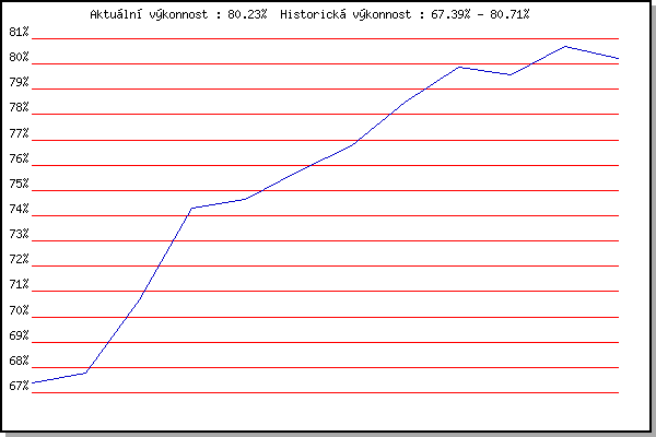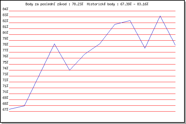 ZávodBodyVýkonnostZměna| 15.08.2018 | Popůvky, 7.9 km | 67.39% | 67.39% | | | 22.08.2018 | Palackého vrch, 7.1 km | 67.97% | 67.79% | +0.40% | | 23.06.2021 | Obřany | 73.26% | 70.68% | +2.89% | | 14.07.2021 | Myslivna | 78.44% | 74.31% | +3.63% | | 21.07.2021 | Obřany | 74.00% | 74.65% | +0.34% | | 28.07.2021 | Palackého vrch | 76.72% | 75.78% | +1.13% | | 04.08.2021 | Pisárky | 78.42% | 76.78% | +1.00% | | 11.08.2021 | Popůvky | 81.76% | 78.50% | +1.72% | | 18.08.2021 | Myslivna | 82.36% | 79.89% | +1.39% | | 01.09.2021 | Obřany | 77.68% | 79.56% | -0.33% | | 08.09.2021 | Kociánka | 83.16% | 80.71% | +1.15% | | 15.09.2021 | Pod Palackého vrchem 5 km | 78.23% | 80.23% | -0.48% | | | | |