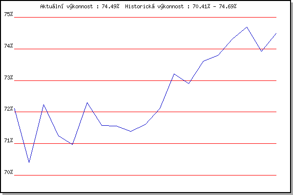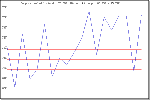 ZávodBodyVýkonnostZměna| 11.05.2011 | Pisárky Anthropos, 6 km | 72.11% | 72.11% | | | 18.05.2011 | Palackého vrch, 7.1 km | 68.23% | 70.41% | -1.70% | | 25.05.2011 | Obřany, 8.8 km | 73.51% | 72.24% | +1.83% | | 29.06.2011 | Obřany, 8.8 km | 69.07% | 71.25% | -0.99% | | 22.05.2013 | Palackého vrch, 7.1 km | 70.05% | 70.98% | -0.27% | | 29.05.2013 | Obřany, 8.8 km | 74.46% | 72.30% | +1.32% | | 05.06.2013 | Líšeň, 11 km | 69.30% | 71.57% | -0.73% | | 12.06.2013 | Popůvky, 7.3 km | 71.10% | 71.56% | -0.01% | | 19.06.2013 | Pisárky Anthropos, 6 km | 70.49% | 71.39% | -0.17% | | 03.07.2013 | Obřany, 8.8 km | 71.73% | 71.60% | +0.21% | | 10.07.2013 | Popůvky, 7.3 km | 73.13% | 72.11% | +0.51% | | 17.07.2013 | Atletický stadión Pod Palackého vrche | 75.77% | 73.21% | +1.10% | | 31.07.2013 | Palackého vrch, 7.1 km | 71.49% | 72.90% | -0.31% | | 07.08.2013 | Obřany, 8.8 km | 75.20% | 73.61% | +0.71% | | 14.08.2013 | Atletický stadión Pod Palackého vrche | 73.89% | 73.80% | +0.19% | | 21.08.2013 | Líšeň, 11 km | 75.28% | 74.30% | +0.50% | | 28.08.2013 | Popůvky, 7.3 km | 75.27% | 74.69% | +0.39% | | 04.09.2013 | Atletický stadión Pod Palackého vrche | 69.82% | 73.92% | -0.77% | | 11.09.2013 | Líšeň, 11 km | 75.39% | 74.49% | +0.57% | | | | |