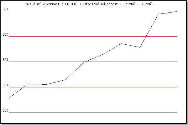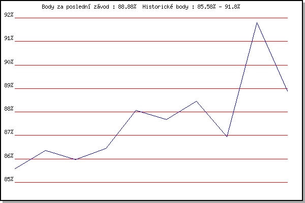 Závod| Body | Výkonnost | Změna | 22.05.2019 | Obřany, 8.8 km | 85.58% | 85.58% | | 12.06.2019 | Popůvky, 7.9 km | 86.36% | 86.12% | +0.54% | 31.07.2019 | Popůvky, 7.9 km | 85.97% | 86.10% | -0.02% | 14.08.2019 | Palackého vrch, 7.1 km | 86.45% | 86.28% | +0.18% | 28.08.2019 | Obřany, 8.8 km | 88.07% | 86.98% | +0.70% | 15.07.2020 | Obřany, 8.8 km | 87.68% | 87.28% | +0.30% | 29.07.2020 | Hotel Myslivna, 7 km | 88.45% | 87.72% | +0.44% | 12.08.2020 | Palackého vrch, 7.1 km | 86.94% | 87.57% | -0.15% | 04.08.2021 | Pisárky | 91.80% | 88.88% | +1.31% | 01.09.2021 | Obřany | 88.88% | 88.99% | +0.11% | | |