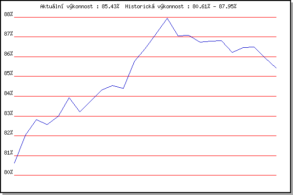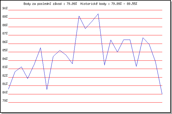 ZávodBodyVýkonnostZměna| 25.05.2011 | Obřany, 8.8 km | 80.61% | 80.61% | | | 01.06.2011 | Líšeň Mariánské údolí, 11.1 km | 82.67% | 82.05% | +1.44% | | 08.06.2011 | Veselka, Popůvky Vintrovna, 7.9 km | 83.26% | 82.81% | +0.76% | | 15.06.2011 | Pisárky Anthropos, 6 km | 81.87% | 82.56% | -0.25% | | 23.06.2011 | Palackého vrch – Běh Olympijského dne | 83.56% | 82.98% | +0.42% | | 29.06.2011 | Obřany, 8.8 km | 85.52% | 83.93% | +0.95% | | 20.07.2011 | AC Moravská Slávia, 5km atletický o | 80.52% | 83.22% | -0.71% | | 27.07.2011 | Pisárky Anthropos, 6 km | 84.46% | 83.76% | +0.54% | | 03.08.2011 | Palackého vrch, 7.1 km | 85.20% | 84.33% | +0.57% | | 10.08.2011 | Obřany, 8.8 km | 84.62% | 84.55% | +0.22% | | 17.08.2011 | AC Moravská Slávia, 10km atletický | 83.63% | 84.39% | -0.16% | | 31.08.2011 | Popůvky, 7.9 km | 89.28% | 85.78% | +1.39% | | 07.09.2011 | Pisárky Anthropos, 6 km | 87.80% | 86.43% | +0.65% | | 14.09.2011 | Líšeň Mariánské údolí, 11.1 km | 88.59% | 87.15% | +0.72% | | 21.09.2011 | AC Moravská Slávia Brno, 1hod atlet | 89.55% | 87.95% | +0.80% | | 25.07.2012 | Pisárky Anthropos, 6 km | 83.46% | 87.06% | -0.89% | | 01.08.2012 | Palackého vrch, 7.1 km | 86.44% | 87.09% | +0.03% | | 08.08.2012 | Obřany, 8.8 km | 85.00% | 86.74% | -0.35% | | 15.08.2012 | Atletický stadión Pod Palackého vrche | 86.47% | 86.80% | +0.06% | | 22.08.2012 | Líšeň Mariánské údolí, 11 km | 86.46% | 86.82% | +0.02% | | 29.08.2012 | Pisárky Anthropos, 6 km | 83.29% | 86.21% | -0.61% | | 05.09.2012 | Popůvky, 7.9 km | 86.71% | 86.48% | +0.27% | | 12.09.2012 | Líšeň Mariánské údolí, 11 km | 85.93% | 86.49% | +0.01% | | 19.09.2012 | Atletický stadión Pod Palackého vrche | 83.81% | 85.96% | -0.53% | | 02.07.2014 | Obřany, 8.8 km | 79.99% | 85.43% | -0.53% | | | | |