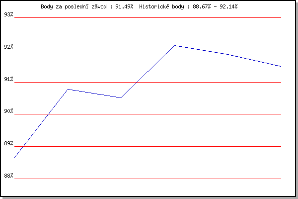 Závod| Body | Výkonnost | Změna | 04.09.2019 | Hotel Myslivna, 7 km | 88.67% | 88.67% | | 08.07.2020 | Pisárky Anthropos, 6 km | 90.78% | 90.14% | +1.47% | 05.08.2020 | Popůvky, 7.9 km | 90.51% | 90.48% | +0.34% | 12.08.2020 | Palackého vrch, 7.1 km | 92.14% | 91.27% | +0.79% | 02.09.2020 | Líšeň, 11 km | 91.85% | 91.55% | +0.28% | 16.09.2020 | Atletický stadión Pod Palackého vrche | 91.49% | 91.60% | +0.05% | | |
