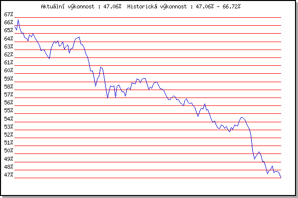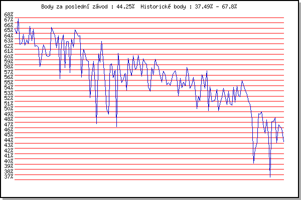 ZávodBodyVýkonnostZměna| 24.05.2006 | Obřany, 8.8 km | 65.86% | 65.86% | | | 31.05.2006 | Palackého vrch vodárna, 9 km | 64.93% | 65.45% | -0.41% | | 07.06.2006 | Líšeň Mariánské údolí, 11.1 km | 67.80% | 66.72% | +1.27% | | 14.06.2006 | Veselka, Popůvky Vintrovna, 7.9 km | 62.96% | 65.79% | -0.93% | | 28.06.2006 | Pisárky Anthropos, 6.6 km | 63.06% | 64.99% | -0.80% | | 12.07.2006 | Obřany, 8.8 km | 64.85% | 65.08% | +0.09% | | 25.07.2006 | Veselka Popůvky Vintrovna, 7.9 km | 62.70% | 64.54% | -0.54% | | 02.08.2006 | Pisárky Anthropos, 6.6 km | 63.79% | 64.42% | -0.12% | | 09.08.2006 | Palackého vrch, 9 km | 63.04% | 64.11% | -0.31% | | 16.08.2006 | Obřany, 8.8 km | 66.41% | 64.82% | +0.71% | | 16.05.2007 | Pisárky Anthropos, 6.6 km | 63.64% | 64.59% | -0.23% | | 23.05.2007 | Obřany, 8.8 km | 65.79% | 65.00% | +0.41% | | 06.06.2007 | Veselka, Popůvky Vintrovna, 7.9 km | 62.54% | 64.56% | -0.44% | | 13.06.2007 | Pisárky Anthropos, 6.6 km | 62.64% | 64.16% | -0.40% | | 27.06.2007 | Obřany, 8.8 km | 62.38% | 63.83% | -0.33% | | 04.07.2007 | Líšeň Mariánské údolí, 11.1 km | 58.61% | 63.51% | -0.32% | | 11.07.2007 | Veselka, Popůvky Vintrovna, 7.9 km | 60.22% | 62.86% | -0.65% | | 25.07.2007 | Pisárky Anthropos, 6.6 km | 62.84% | 62.98% | +0.12% | | 01.08.2007 | Obřany, 8.8 km | 62.14% | 62.91% | -0.07% | | 08.08.2007 | Líšeň Mariánské údolí, 11.1 km | 60.73% | 62.49% | -0.42% | | 15.08.2007 | Moravská Slávia dráha, 10 km | 60.64% | 62.12% | -0.37% | | 08.05.2008 | Běh o pohár pivovaru Černá hora, 9.2 | 60.71% | 61.85% | -0.27% | | 14.05.2008 | Pisárky Anthropos, 6.3 km | 66.17% | 63.02% | +1.17% | | 21.05.2008 | Obřany, 8.8 km | 65.25% | 63.70% | +0.68% | | 28.05.2008 | Líšeň Mariánské údolí, 11.1 km | 64.53% | 64.05% | +0.35% | | 04.06.2008 | Veselka, Popůvky Vintrovna, 9.6 km | 62.30% | 63.78% | -0.27% | | 11.06.2008 | Pisárky Anthropos, 6.3 km | 64.52% | 64.12% | +0.34% | | 18.06.2008 | Obřany, 8.8 km | 56.33% | 63.40% | -0.72% | | 09.07.2008 | Veselka, Popůvky Vintrovna, 7.9 km | 63.20% | 63.52% | +0.12% | | 23.07.2008 | Moravská Slavia , 15 km | 64.75% | 63.97% | +0.45% | | 30.07.2008 | Obřany, 8.8 km | 58.45% | 63.03% | -0.94% | | 06.08.2008 | Líšeň Mariánské údolí, 11.1 km | 63.38% | 63.34% | +0.31% | | 28.09.2008 | Blažovice Svatováclavský běh, 11 km | 63.38% | 63.58% | +0.24% | | 13.05.2009 | Pisárky Anthropos, 6.3 km | 57.44% | 62.53% | -1.05% | | 10.06.2009 | Pisárky Anthropos, 6.3 km | 63.94% | 63.13% | +0.60% | | 15.07.2009 | Pisárky Anthropos, 6.3 km | 62.34% | 63.16% | +0.03% | | 29.07.2009 | Obřany, 8.8 km | 65.67% | 63.98% | +0.82% | | 05.08.2009 | Líšeň Mariánské údolí, 11.1 km | 65.14% | 64.36% | +0.38% | | 19.08.2009 | Moravská Slavia dráha, 10 km | 64.42% | 64.47% | +0.11% | | 28.09.2009 | Blažovice Svatováclavský běh, 11 km | 64.54% | 64.59% | +0.12% | | 08.05.2010 | Běh o pohár pivovaru Černá hora, 9. | 56.65% | 63.72% | -0.87% | | 12.05.2010 | Pisárky Anthropos, 6.3 km | 61.95% | 63.58% | -0.14% | | 26.05.2010 | Obřany, 8.8 km | 61.15% | 63.17% | -0.41% | | 02.06.2010 | Líšeň Mariánské údolí, 11.1 km | 59.87% | 62.55% | -0.62% | | 16.06.2010 | Pisárky Anthropos, 6.3 km | 59.68% | 61.99% | -0.56% | | 23.06.2010 | Palackého vrch Běh Olympijského dne | 52.73% | 61.25% | -0.74% | | 30.06.2010 | Obřany, 8.8 km | 56.49% | 60.32% | -0.93% | | 21.07.2010 | Moravská Slavia dráha, 5 km | 59.69% | 60.35% | +0.03% | | 04.08.2010 | Palackého vrch , 7.1 km | 55.45% | 59.47% | -0.88% | | 25.08.2010 | Líšeň Mariánské údolí, 11.1 km | 47.68% | 58.43% | -1.04% | | 22.09.2010 | Moravská Slavia dráha, 15 km | 61.14% | 59.39% | +0.96% | | 28.09.2010 | Blažovice Svatováclavský běh, 9.4 km | 59.51% | 59.67% | +0.28% | | 09.10.2010 | Mizuno sedmička, 7 km | 63.47% | 60.84% | +1.17% | | 11.05.2011 | Pisárky Anthropos, 6 km | 58.94% | 60.61% | -0.23% | | 18.05.2011 | Palackého vrch, 7.1 km | 55.53% | 59.65% | -0.96% | | 15.06.2011 | Pisárky Anthropos, 6 km | 50.62% | 58.48% | -1.17% | | 23.06.2011 | Palackého vrch – Běh Olympijského dne | 49.51% | 56.95% | -1.53% | | 27.07.2011 | Pisárky Anthropos, 6 km | 59.00% | 57.80% | +0.85% | | 10.08.2011 | Obřany, 8.8 km | 59.21% | 58.49% | +0.69% | | 17.08.2011 | AC Moravská Slávia, 10km atletický | 56.49% | 58.37% | -0.12% | | 24.08.2011 | Líšeň Mariánské údolí, 11.1 km | 57.96% | 58.46% | +0.09% | | 07.09.2011 | Pisárky Anthropos, 6 km | 47.10% | 56.99% | -1.47% | | 09.05.2012 | Pisárky Anthropos, 6 km | 61.19% | 58.43% | +1.44% | | 16.05.2012 | Palackého vrch, 7.1 km | 57.66% | 58.63% | +0.20% | | 30.05.2012 | Líšeň Mariánské údolí, 11 km | 55.55% | 58.09% | -0.54% | | 06.06.2012 | Popůvky, 7.9 km | 56.14% | 57.73% | -0.36% | | 27.06.2012 | Obřany, 8.8 km | 57.42% | 57.77% | +0.04% | | 11.07.2012 | Popůvky, 7.9 km | 54.14% | 57.18% | -0.59% | | 18.07.2012 | Atletický stadión Pod Palackého vrche | 60.28% | 58.11% | +0.93% | | 25.07.2012 | Pisárky Anthropos, 6 km | 57.90% | 58.23% | +0.12% | | 01.08.2012 | Palackého vrch, 7.1 km | 56.93% | 58.03% | -0.20% | | 08.08.2012 | Obřany, 8.8 km | 60.77% | 58.83% | +0.80% | | 15.08.2012 | Atletický stadión Pod Palackého vrche | 58.13% | 58.77% | -0.06% | | 22.08.2012 | Líšeň Mariánské údolí, 11 km | 58.29% | 58.74% | -0.03% | | 19.09.2012 | Atletický stadión Pod Palackého vrche | 60.86% | 59.36% | +0.62% | | 15.05.2013 | Pisárky Anthropos, 6 km | 58.75% | 59.30% | -0.06% | | 22.05.2013 | Palackého vrch, 7.1 km | 56.77% | 58.84% | -0.46% | | 29.05.2013 | Obřany, 8.8 km | 60.13% | 59.27% | +0.43% | | 05.06.2013 | Líšeň, 11 km | 59.31% | 59.40% | +0.13% | | 19.06.2013 | Pisárky Anthropos, 6 km | 59.07% | 59.41% | +0.01% | | 26.06.2013 | Palackého vrch – Běh Olympijského dne | 54.80% | 58.87% | -0.54% | | 31.07.2013 | Palackého vrch, 7.1 km | 53.96% | 58.07% | -0.80% | | 14.08.2013 | Atletický stadión Pod Palackého vrche 