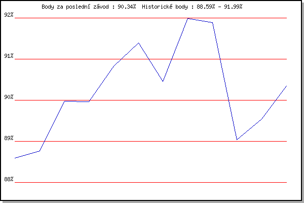 ZávodBodyVýkonnostZměna| 08.07.2020 | Pisárky Anthropos, 6 km | 88.59% | 88.58% | | | 15.07.2020 | Obřany, 8.8 km | 88.76% | 88.70% | +0.12% | | 22.07.2020 | Kociánka, 2.7 km | 89.97% | 89.36% | +0.66% | | 29.07.2020 | Hotel Myslivna, 7 km | 89.96% | 89.68% | +0.32% | | 05.08.2020 | Popůvky, 7.9 km | 90.83% | 90.18% | +0.50% | | 12.08.2020 | Palackého vrch, 7.1 km | 91.40% | 90.69% | +0.51% | | 19.08.2020 | Obřany, 8.8 km | 90.46% | 90.66% | -0.03% | | 26.08.2020 | Atletický stadión Pod Palackého vrche | 91.99% | 91.10% | +0.44% | | 02.09.2020 | Líšeň, 11 km | 91.89% | 91.39% | +0.29% | | 09.09.2020 | Pisárky Anthropos, 6 km | 89.04% | 90.97% | -0.42% | | 30.06.2021 | Líšeň | 89.54% | 90.69% | -0.28% | | 07.07.2021 | Pisárky | 90.34% | 90.67% | -0.02% | | | | |