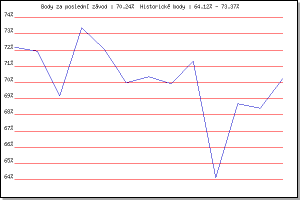 ZávodBodyVýkonnostZměna| 01.07.2020 | Atletický stadión Pod Palackého vrche | 72.17% | 72.17% | | | 08.07.2020 | Pisárky Anthropos, 6 km | 71.93% | 72.06% | -0.11% | | 15.07.2020 | Obřany, 8.8 km | 69.20% | 71.30% | -0.76% | | 22.07.2020 | Kociánka, 2.7 km | 73.37% | 72.36% | +1.06% | | 29.07.2020 | Hotel Myslivna, 7 km | 72.05% | 72.44% | +0.08% | | 12.08.2020 | Palackého vrch, 7.1 km | 69.98% | 71.80% | -0.64% | | 19.08.2020 | Obřany, 8.8 km | 70.35% | 71.46% | -0.34% | | 26.08.2020 | Atletický stadión Pod Palackého vrche | 69.92% | 71.10% | -0.36% | | 09.09.2020 | Pisárky Anthropos, 6 km | 71.31% | 71.22% | +0.12% | | 21.07.2021 | Obřany | 64.12% | 70.73% | -0.49% | | 04.08.2021 | Pisárky | 68.70% | 70.39% | -0.34% | | 11.08.2021 | Popůvky | 68.40% | 69.97% | -0.42% | | 18.08.2021 | Myslivna | 70.24% | 70.13% | +0.16% | | | | |