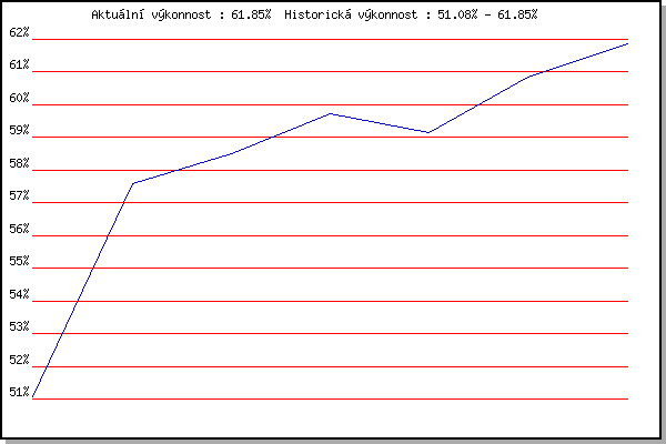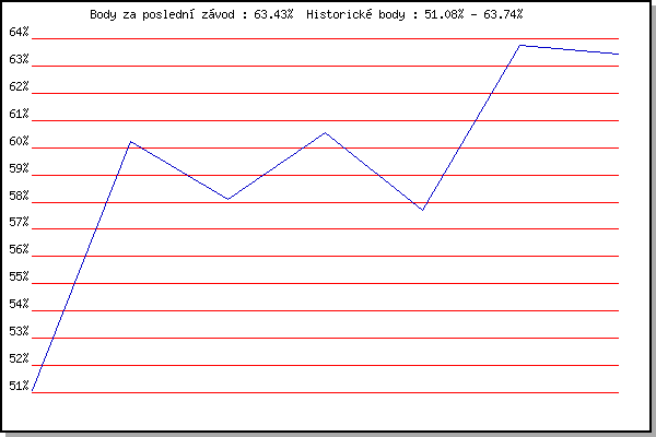 Závod| Body | Výkonnost | Změna | 14.08.2019 | Palackého vrch, 7.1 km | 51.08% | 51.08% | | 08.07.2020 | Pisárky Anthropos, 6 km | 60.24% | 57.60% | +6.52% | 22.07.2020 | Kociánka, 2.7 km | 58.12% | 58.49% | +0.89% | 19.08.2020 | Obřany, 8.8 km | 60.55% | 59.73% | +1.24% | 26.08.2020 | Atletický stadión Pod Palackého vrche | 57.69% | 59.14% | -0.59% | 02.09.2020 | Líšeň, 11 km | 63.74% | 60.84% | +1.70% | 09.06.2021 | Pisárky | 63.43% | 61.85% | +1.01% | | |