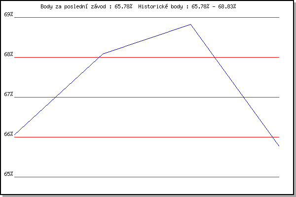 Závod| Body | Výkonnost | Změna | 12.08.2020 | Palackého vrch, 7.1 km | 66.06% | 66.06% | | 19.08.2020 | Obřany, 8.8 km | 68.09% | 67.47% | +1.41% | 26.08.2020 | Atletický stadión Pod Palackého vrche | 68.83% | 68.32% | +0.85% | 16.09.2020 | Atletický stadión Pod Palackého vrche | 65.78% | 67.51% | -0.81% | | |