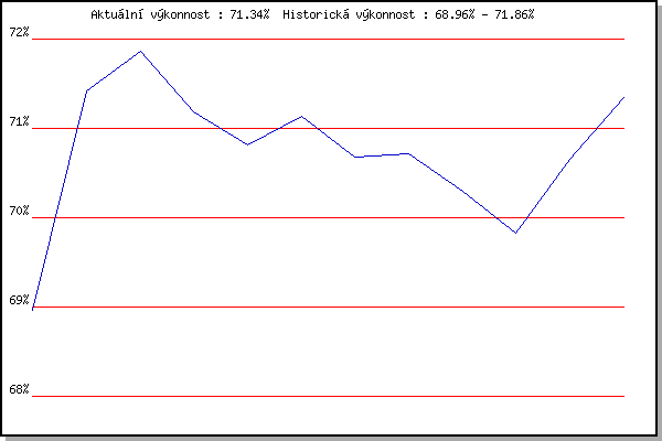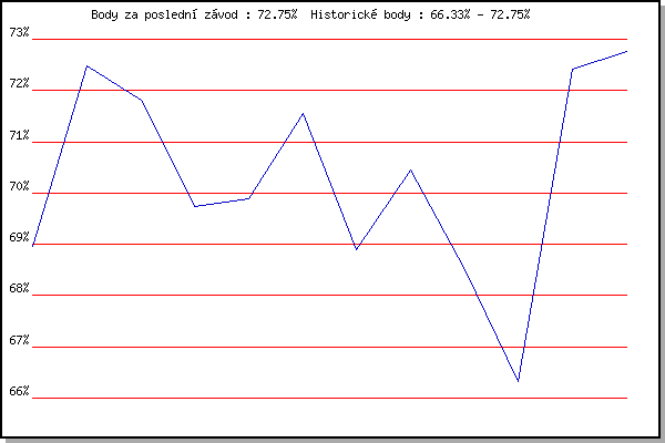 Závod| Body | Výkonnost | Změna | 02.06.2021 | Pod Palackého vrchem 10 km | 68.96% | 68.96% | | 09.06.2021 | Pisárky | 72.48% | 71.42% | +2.46% | 16.06.2021 | Palackého vrch | 71.80% | 71.86% | +0.44% | 23.06.2021 | Obřany | 69.74% | 71.19% | -0.67% | 30.06.2021 | Líšeň | 69.89% | 70.82% | -0.37% | 07.07.2021 | Pisárky | 71.56% | 71.14% | +0.32% | 28.07.2021 | Palackého vrch | 68.90% | 70.68% | -0.46% | 11.08.2021 | Popůvky | 70.46% | 70.71% | +0.03% | 18.08.2021 | Myslivna | 68.51% | 70.29% | -0.42% | 25.08.2021 | Líšeň | 66.33% | 69.83% | -0.46% | 01.09.2021 | Obřany | 72.42% | 70.66% | +0.83% | 08.09.2021 | Kociánka | 72.75% | 71.34% | +0.68% | | |