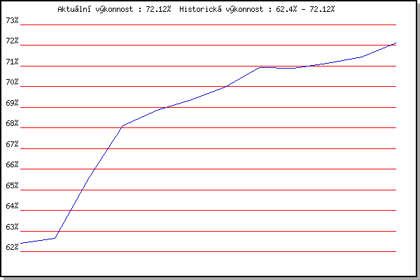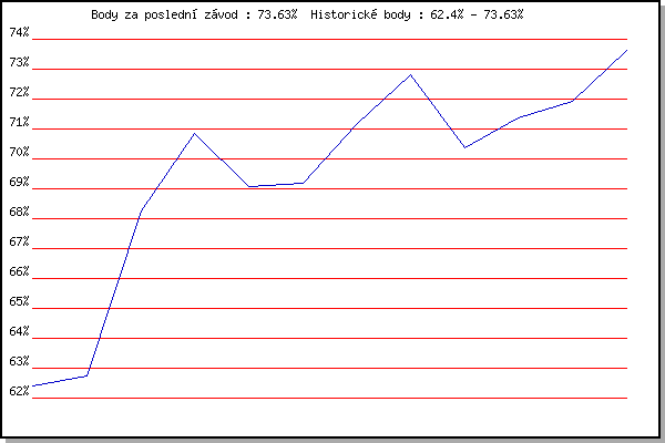Závod| Body | Výkonnost | Změna | 09.06.2021 | Pisárky | 62.40% | 62.40% | | 16.06.2021 | Palackého vrch | 62.75% | 62.65% | +0.25% | 30.06.2021 | Líšeň | 68.27% | 65.61% | +2.96% | 07.07.2021 | Pisárky | 70.85% | 68.12% | +2.51% | 14.07.2021 | Myslivna | 69.06% | 68.85% | +0.73% | 21.07.2021 | Obřany | 69.18% | 69.35% | +0.50% | 28.07.2021 | Palackého vrch | 71.13% | 69.99% | +0.64% | 04.08.2021 | Pisárky | 72.82% | 70.94% | +0.95% | 18.08.2021 | Myslivna | 70.37% | 70.89% | -0.05% | 25.08.2021 | Líšeň | 71.36% | 71.12% | +0.23% | 01.09.2021 | Obřany | 71.93% | 71.45% | +0.33% | 08.09.2021 | Kociánka | 73.63% | 72.12% | +0.67% | | |