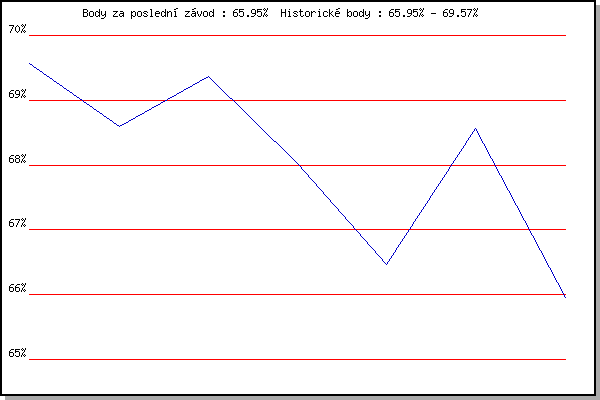 Závod| Body | Výkonnost | Změna | 02.06.2021 | Pod Palackého vrchem 10 km | 69.57% | 69.57% | | 09.06.2021 | Pisárky | 68.59% | 69.14% | -0.43% | 23.06.2021 | Obřany | 69.36% | 69.31% | +0.17% | 30.06.2021 | Líšeň | 68.02% | 68.97% | -0.34% | 14.07.2021 | Myslivna | 66.47% | 68.50% | -0.47% | 21.07.2021 | Obřany | 68.56% | 68.66% | +0.16% | 04.08.2021 | Pisárky | 65.95% | 68.07% | -0.59% | | |