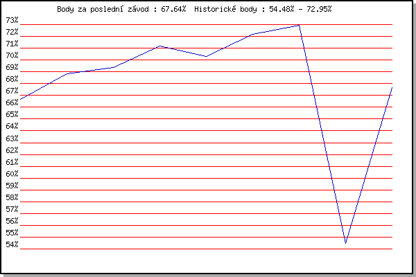 Závod| Body | Výkonnost | Změna | 09.06.2021 | Pisárky | 66.69% | 66.69% | | 16.06.2021 | Palackého vrch | 68.82% | 68.18% | +1.49% | 23.06.2021 | Obřany | 69.36% | 68.93% | +0.75% | 07.07.2021 | Pisárky | 71.18% | 70.01% | +1.08% | 14.07.2021 | Myslivna | 70.31% | 70.21% | +0.20% | 21.07.2021 | Obřany | 72.19% | 70.98% | +0.77% | 28.07.2021 | Palackého vrch | 72.95% | 71.71% | +0.73% | 04.08.2021 | Pisárky | 54.48% | 70.29% | -1.42% | 11.08.2021 | Popůvky | 67.64% | 70.15% | -0.14% | | |