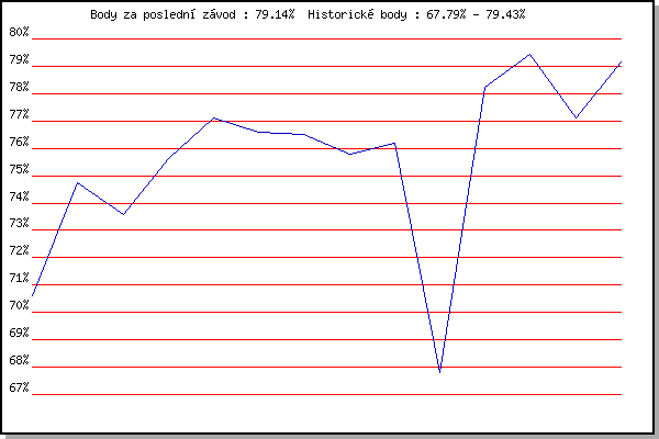 ZávodBodyVýkonnostZměna| 02.06.2021 | Pod Palackého vrchem 10 km | 70.61% | 70.60% | | | 09.06.2021 | Pisárky | 74.73% | 73.49% | +2.89% | | 16.06.2021 | Palackého vrch | 73.60% | 73.83% | +0.34% | | 23.06.2021 | Obřany | 75.63% | 74.77% | +0.94% | | 30.06.2021 | Líšeň | 77.09% | 75.72% | +0.95% | | 07.07.2021 | Pisárky | 76.57% | 76.15% | +0.43% | | 14.07.2021 | Myslivna | 76.49% | 76.38% | +0.23% | | 21.07.2021 | Obřany | 75.78% | 76.29% | -0.09% | | 28.07.2021 | Palackého vrch | 76.17% | 76.30% | +0.01% | | 04.08.2021 | Pisárky | 67.79% | 75.58% | -0.72% | | 11.08.2021 | Popůvky | 78.24% | 76.63% | +1.05% | | 18.08.2021 | Myslivna | 79.43% | 77.53% | +0.90% | | 01.09.2021 | Obřany | 77.09% | 77.52% | -0.01% | | 08.09.2021 | Kociánka | 79.14% | 78.03% | +0.51% | | | | |
