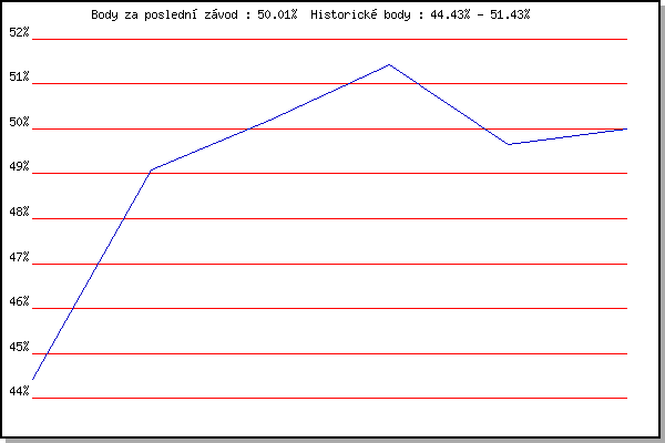 Závod| Body | Výkonnost | Změna | 02.06.2021 | Pod Palackého vrchem 10 km | 44.43% | 44.43% | | 09.06.2021 | Pisárky | 49.09% | 47.72% | +3.29% | 16.06.2021 | Palackého vrch | 50.19% | 49.32% | +1.60% | 23.06.2021 | Obřany | 51.43% | 50.46% | +1.14% | 28.07.2021 | Palackého vrch | 49.65% | 50.26% | -0.20% | 04.08.2021 | Pisárky | 50.01% | 50.26% | 0.00% | | |