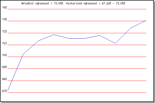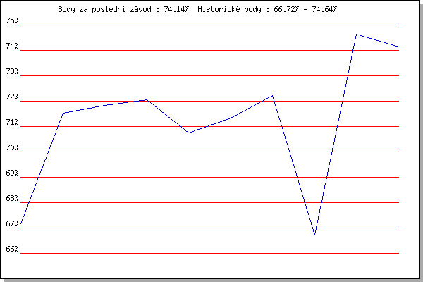 ZávodBodyVýkonnostZměna| 18.07.2012 | Atletický stadión Pod Palackého vrche | 67.16% | 67.16% | | | 25.07.2012 | Pisárky Anthropos, 6 km | 71.52% | 70.21% | +3.05% | | 01.08.2012 | Palackého vrch, 7.1 km | 71.84% | 71.35% | +1.14% | | 08.08.2012 | Obřany, 8.8 km | 72.05% | 71.85% | +0.50% | | 15.08.2012 | Atletický stadión Pod Palackého vrche | 70.74% | 71.54% | -0.31% | | 29.08.2012 | Pisárky Anthropos, 6 km | 71.34% | 71.53% | -0.01% | | 05.09.2012 | Popůvky, 7.9 km | 72.21% | 71.79% | +0.26% | | 29.05.2013 | Obřany, 8.8 km | 66.72% | 71.13% | -0.66% | | 28.09.2013 | Blažovice – Svatováclavský běh, 11 km | 74.64% | 72.39% | +1.26% | | 22.07.2015 | Pisárky Anthropos, 6 km | 74.14% | 73.05% | +0.66% | | | | |