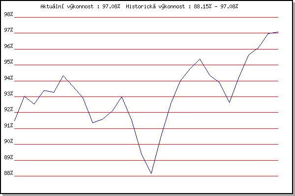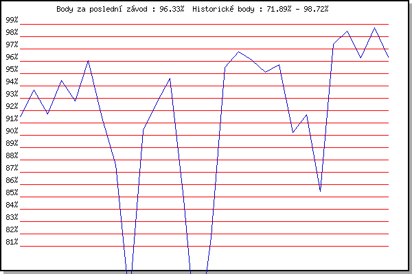 ZávodBodyVýkonnostZměna| 28.06.2006 | Pisárky Anthropos, 6.6 km | 91.50% | 91.50% | | | 12.07.2006 | Obřany, 8.8 km | 93.68% | 93.02% | +1.52% | | 16.08.2006 | Obřany, 8.8 km | 91.74% | 92.53% | -0.49% | | 23.05.2007 | Obřany, 8.8 km | 94.42% | 93.41% | +0.88% | | 25.07.2007 | Pisárky Anthropos, 6.6 km | 92.75% | 93.28% | -0.13% | | 01.08.2007 | Obřany, 8.8 km | 96.05% | 94.33% | +1.05% | | 14.05.2008 | Pisárky Anthropos, 6.3 km | 91.45% | 93.65% | -0.68% | | 21.05.2008 | Obřany, 8.8 km | 87.63% | 92.94% | -0.71% | | 28.09.2008 | Blažovice Svatováclavský běh, 11 km | 76.35% | 91.35% | -1.59% | | 20.05.2009 | Obřany, 8.8 km | 90.39% | 91.59% | +0.24% | | 27.05.2009 | Líšeň Mariánské údolí, 11.1 km | 92.65% | 92.09% | +0.50% | | 10.06.2009 | Pisárky Anthropos, 6.3 km | 94.59% | 92.99% | +0.90% | | 24.06.2009 | Palackého vrch Běh Olympijského dne | 84.81% | 91.56% | -1.43% | | 28.09.2009 | Blažovice Svatováclavský běh, 11 km | 71.89% | 89.41% | -2.15% | | 14.07.2010 | Veselka, Popůvky Vintrovna, 7.9 km | 81.70% | 88.15% | -1.26% | | 28.09.2010 | Blažovice Svatováclavský běh, 9.4 km | 95.52% | 90.51% | +2.36% | | 09.10.2010 | Mizuno sedmička, 7 km | 96.75% | 92.57% | +2.06% | | 28.09.2011 | Blažovice – Svatováclavský běh , 11 k | 96.11% | 94.00% | +1.43% | | 08.08.2012 | Obřany, 8.8 km | 95.12% | 94.77% | +0.77% | | 28.09.2012 | Blažovice – Svatováclavský běh, 11 km | 95.71% | 95.39% | +0.62% | | 28.09.2013 | Blažovice – Svatováclavský běh, 11 km | 90.22% | 94.37% | -1.02% | | 28.09.2014 | Blažovice – Svatováclavský běh, 11 km | 91.66% | 93.90% | -0.47% | | 01.07.2015 | Obřany, 8.8 km | 85.44% | 92.63% | -1.27% | | 28.09.2015 | Blažovice – Svatováclavský běh, 11 km | 97.40% | 94.19% | +1.56% | | 01.06.2016 | Líšeň, 11 km | 98.46% | 95.63% | +1.44% | | 15.06.2016 | Pisárky Anthropos, 6 km | 96.30% | 96.07% | +0.44% | | 22.06.2016 | Palackého vrch Běh Olympijského dne | 98.72% | 96.98% | +0.91% | | 03.08.2016 | Obřany, 8.8 km | 96.33% | 97.08% | +0.10% | | | | |