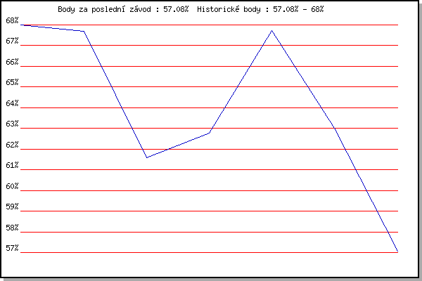 Závod| Body | Výkonnost | Změna | 17.05.2006 | Pisárky Anthropos, 6.6 km | 68.00% | 68.00% | | 24.05.2006 | Obřany, 8.8 km | 67.70% | 67.87% | -0.13% | 31.05.2006 | Palackého vrch vodárna, 9 km | 61.60% | 66.26% | -1.61% | 07.06.2006 | Líšeň Mariánské údolí, 11.1 km | 62.76% | 65.18% | -1.08% | 28.06.2006 | Pisárky Anthropos, 6.6 km | 67.73% | 66.39% | +1.21% | 19.07.2006 | Líšeň Mariánské údolí, 11.1 km | 63.00% | 65.50% | -0.89% | 30.08.2006 | Veselka Popůvky Vintrovna, 7.9 km | 57.08% | 64.33% | -1.17% | | |