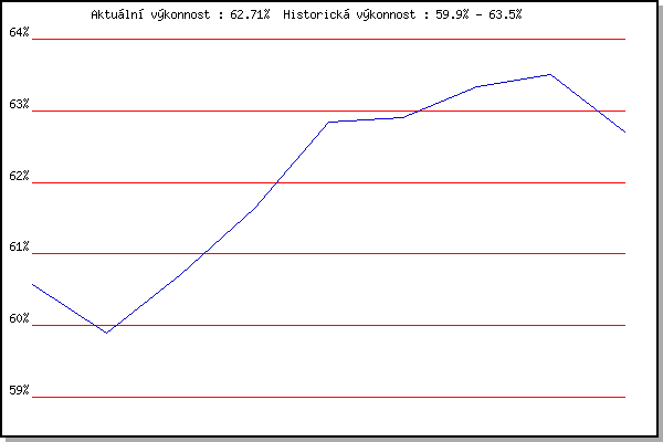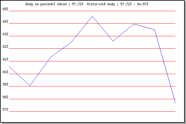 Závod| Body | Výkonnost | Změna | 27.07.2011 | Pisárky Anthropos, 6 km | 60.57% | 60.57% | | 03.08.2011 | Palackého vrch, 7.1 km | 59.06% | 59.90% | -0.67% | 10.08.2011 | Obřany, 8.8 km | 61.33% | 60.72% | +0.82% | 07.09.2011 | Pisárky Anthropos, 6 km | 62.54% | 61.64% | +0.92% | 28.09.2011 | Blažovice – Svatováclavský běh , 11 k | 64.57% | 62.84% | +1.20% | 09.05.2012 | Pisárky Anthropos, 6 km | 62.61% | 62.91% | +0.07% | 16.05.2012 | Palackého vrch, 7.1 km | 63.95% | 63.34% | +0.43% | 23.05.2012 | Obřany, 8.8 km | 63.51% | 63.50% | +0.16% | 13.06.2012 | Pisárky Anthropos, 6 km | 57.72% | 62.71% | -0.79% | | |