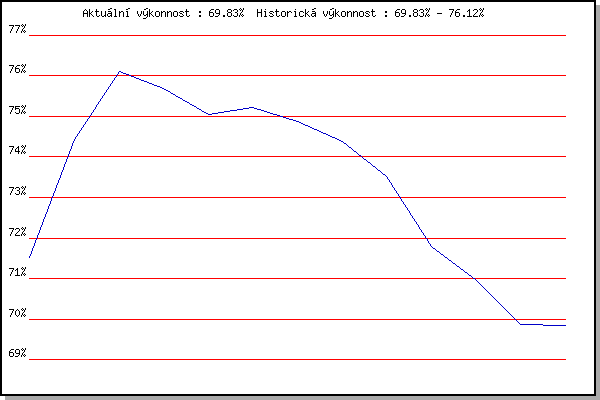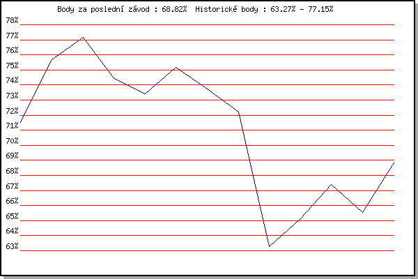 ZávodBodyVýkonnostZměna| 03.08.2011 | Palackého vrch, 7.1 km | 71.54% | 71.53% | | | 16.05.2012 | Palackého vrch, 7.1 km | 75.67% | 74.43% | +2.90% | | 30.05.2012 | Líšeň Mariánské údolí, 11 km | 77.15% | 76.12% | +1.69% | | 06.06.2012 | Popůvky, 7.9 km | 74.45% | 75.70% | -0.42% | | 15.05.2013 | Pisárky Anthropos, 6 km | 73.40% | 75.05% | -0.65% | | 22.05.2013 | Palackého vrch, 7.1 km | 75.18% | 75.21% | +0.16% | | 12.06.2013 | Popůvky, 7.3 km | 73.76% | 74.87% | -0.34% | | 19.06.2013 | Pisárky Anthropos, 6 km | 72.19% | 74.38% | -0.49% | | 08.07.2020 | Pisárky Anthropos, 6 km | 63.27% | 73.53% | -0.85% | | 15.07.2020 | Obřany, 8.8 km | 65.13% | 71.78% | -1.75% | | 29.07.2020 | Hotel Myslivna, 7 km | 67.42% | 70.97% | -0.81% | | 05.08.2020 | Popůvky, 7.9 km | 65.54% | 69.86% | -1.11% | | 02.09.2020 | Líšeň, 11 km | 68.82% | 69.83% | -0.03% | | | | |
