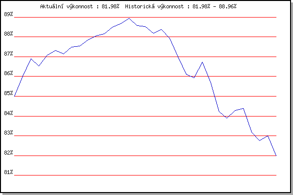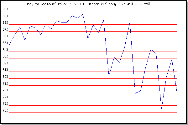 ZávodBodyVýkonnostZměna| 24.05.2006 | Obřany, 8.8 km | 84.99% | 84.99% | | | 31.05.2006 | Palackého vrch vodárna, 9 km | 86.44% | 86.00% | +1.01% | | 07.06.2006 | Líšeň Mariánské údolí, 11.1 km | 87.57% | 86.91% | +0.91% | | 14.06.2006 | Veselka, Popůvky Vintrovna, 7.9 km | 85.69% | 86.53% | -0.38% | | 28.06.2006 | Pisárky Anthropos, 6.6 km | 87.82% | 87.08% | +0.55% | | 12.07.2006 | Obřany, 8.8 km | 87.51% | 87.32% | +0.24% | | 09.08.2006 | Palackého vrch, 9 km | 86.47% | 87.15% | -0.17% | | 16.08.2006 | Obřany, 8.8 km | 88.18% | 87.50% | +0.35% | | 23.08.2006 | Líšeň Mariánské údolí, 11.1 km | 87.38% | 87.53% | +0.03% | | 30.08.2006 | Veselka Popůvky Vintrovna, 7.9 km | 88.56% | 87.87% | +0.34% | | 16.05.2007 | Pisárky Anthropos, 6.6 km | 88.32% | 88.06% | +0.19% | | 23.05.2007 | Obřany, 8.8 km | 88.33% | 88.17% | +0.11% | | 13.06.2007 | Pisárky Anthropos, 6.6 km | 89.29% | 88.51% | +0.34% | | 04.07.2007 | Líšeň Mariánské údolí, 11.1 km | 88.97% | 88.68% | +0.17% | | 11.07.2007 | Veselka, Popůvky Vintrovna, 7.9 km | 89.55% | 88.96% | +0.28% | | 15.08.2007 | Moravská Slávia dráha, 10 km | 85.91% | 88.57% | -0.39% | | 22.08.2007 | Veselka, Popůvky Vintrovna, 7.9 km | 87.98% | 88.54% | -0.03% | | 09.07.2008 | Veselka, Popůvky Vintrovna, 7.9 km | 86.74% | 88.18% | -0.36% | | 13.08.2008 | Veselka, Popůvky Vintrovna, 7.9 km | 88.69% | 88.38% | +0.20% | | 20.05.2009 | Obřany, 8.8 km | 80.37% | 87.93% | -0.45% | | 03.06.2009 | Veselka, Popůvky Vintrovna, 7.9 km | 83.17% | 86.99% | -0.94% | | 17.06.2009 | Obřany, 8.8 km | 82.39% | 86.12% | -0.87% | | 15.07.2009 | Pisárky Anthropos, 6.3 km | 84.63% | 85.93% | -0.19% | | 12.08.2009 | Veselka, Popůvky Vintrovna, 7.9 km | 88.35% | 86.72% | +0.79% | | 11.05.2011 | Pisárky Anthropos, 6 km | 77.83% | 85.70% | -1.02% | | 18.05.2011 | Palackého vrch, 7.1 km | 78.16% | 84.24% | -1.46% | | 25.05.2011 | Obřany, 8.8 km | 81.64% | 83.89% | -0.35% | | 15.06.2011 | Pisárky Anthropos, 6 km | 84.34% | 84.29% | +0.40% | | 23.06.2011 | Palackého vrch – Běh Olympijského dne | 83.66% | 84.38% | +0.09% | | 29.06.2011 | Obřany, 8.8 km | 75.49% | 83.18% | -1.20% | | 31.08.2011 | Popůvky, 7.9 km | 80.37% | 82.75% | -0.43% | | 28.09.2011 | Blažovice – Svatováclavský běh , 11 k | 82.83% | 82.99% | +0.24% | | 28.09.2012 | Blažovice – Svatováclavský běh, 11 km | 77.68% | 81.98% | -1.01% | | | | |