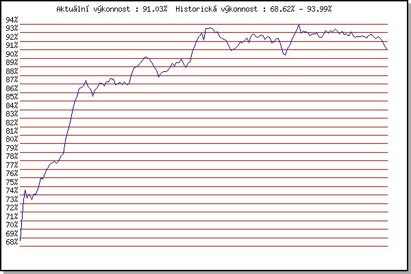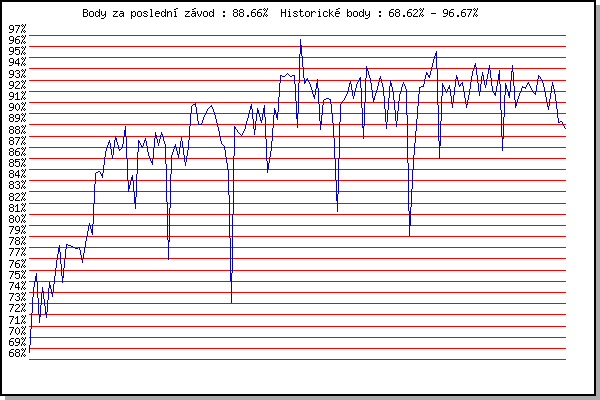 ZávodBodyVýkonnostZměna| 10.08.2011 | Obřany, 8.8 km | 68.62% | 68.62% | | | 09.05.2012 | Pisárky Anthropos, 6 km | 74.30% | 72.62% | +4.00% | | 16.05.2012 | Palackého vrch, 7.1 km | 75.74% | 74.62% | +2.00% | | 23.05.2012 | Obřany, 8.8 km | 71.30% | 73.64% | -0.98% | | 30.05.2012 | Líšeň Mariánské údolí, 11 km | 74.41% | 74.10% | +0.46% | | 06.06.2012 | Popůvky, 7.9 km | 71.74% | 73.50% | -0.60% | | 13.06.2012 | Pisárky Anthropos, 6 km | 74.92% | 74.08% | +0.58% | | 20.06.2012 | Palackého vrch – Běh Olympijského dne | 73.68% | 74.10% | +0.02% | | 27.06.2012 | Obřany, 8.8 km | 76.58% | 74.96% | +0.86% | | 11.07.2012 | Popůvky, 7.9 km | 78.22% | 76.01% | +1.05% | | 18.07.2012 | Atletický stadión Pod Palackého vrche | 74.93% | 75.84% | -0.17% | | 25.07.2012 | Pisárky Anthropos, 6 km | 78.33% | 76.63% | +0.79% | | 01.08.2012 | Palackého vrch, 7.1 km | 78.23% | 77.18% | +0.55% | | 08.08.2012 | Obřany, 8.8 km | 78.13% | 77.55% | +0.37% | | 15.08.2012 | Atletický stadión Pod Palackého vrche | 77.98% | 77.79% | +0.24% | | 29.08.2012 | Pisárky Anthropos, 6 km | 78.00% | 77.99% | +0.20% | | 05.09.2012 | Popůvky, 7.9 km | 76.70% | 77.74% | -0.25% | | 12.09.2012 | Líšeň Mariánské údolí, 11 km | 78.37% | 77.96% | +0.22% | | 19.09.2012 | Atletický stadión Pod Palackého vrche | 80.17% | 78.59% | +0.63% | | 28.09.2012 | Blažovice – Svatováclavský běh, 11 km | 79.18% | 78.83% | +0.24% | | 15.05.2013 | Pisárky Anthropos, 6 km | 84.62% | 80.38% | +1.55% | | 22.05.2013 | Palackého vrch, 7.1 km | 84.79% | 81.63% | +1.25% | | 05.06.2013 | Líšeň, 11 km | 84.33% | 82.49% | +0.86% | | 26.06.2013 | Palackého vrch – Běh Olympijského dne | 86.57% | 83.74% | +1.25% | | 03.07.2013 | Obřany, 8.8 km | 87.63% | 84.99% | +1.25% | | 10.07.2013 | Popůvky, 7.3 km | 86.02% | 85.53% | +0.54% | | 17.07.2013 | Atletický stadión Pod Palackého vrche | 88.00% | 86.43% | +0.90% | | 24.07.2013 | Pisárky Anthropos, 6 km | 86.71% | 86.64% | +0.21% | | 07.08.2013 | Obřany, 8.8 km | 86.96% | 86.83% | +0.19% | | 14.08.2013 | Atletický stadión Pod Palackého vrche | 88.84% | 87.44% | +0.61% | | 21.08.2013 | Líšeň, 11 km | 83.02% | 86.71% | -0.73% | | 28.08.2013 | Popůvky, 7.3 km | 84.46% | 86.34% | -0.37% | | 11.09.2013 | Líšeň, 11 km | 81.54% | 85.59% | -0.75% | | 18.09.2013 | Pisárky Anthropos, 6 km | 87.64% | 86.30% | +0.71% | | 28.09.2013 | Blažovice – Svatováclavský běh, 11 km | 86.98% | 86.64% | +0.34% | | 14.05.2014 | Pisárky Anthropos, 6 km | 87.81% | 87.10% | +0.46% | | 21.05.2014 | Palackého vrch, 7.1 km | 86.39% | 87.06% | -0.04% | | 28.05.2014 | Obřany, 8.8 km | 85.47% | 86.78% | -0.28% | | 04.06.2014 | Líšeň, 11 km | 88.31% | 87.23% | +0.45% | | 11.06.2014 | Popůvky, 7.9 km | 87.12% | 87.29% | +0.06% | | 16.07.2014 | Atletický stadión Pod Palackého vrche | 88.29% | 87.63% | +0.34% | | 23.07.2014 | Pisárky Anthropos, 6 km | 87.11% | 87.57% | -0.06% | | 30.07.2014 | Palackého vrch, 7.1 km | 76.91% | 86.97% | -0.60% | | 06.08.2014 | Obřany, 8.8 km | 86.17% | 87.00% | +0.03% | | 13.08.2014 | Atletický stadión Pod Palackého vrche | 87.24% | 87.15% | +0.15% | | 27.08.2014 | Popůvky, 5.3 km | 86.07% | 86.94% | -0.21% | | 03.09.2014 | Atletický stadión Pod Palackého vrche | 87.91% | 87.22% | +0.28% | | 10.09.2014 | Líšeň, 11 km | 85.36% | 86.90% | -0.32% | | 17.09.2014 | Pisárky Anthropos, 6 km | 87.06% | 87.02% | +0.12% | | 28.09.2014 | Blažovice – Svatováclavský běh, 11 km | 90.68% | 88.02% | +1.00% | | 13.05.2015 | Pisárky Anthropos, 6 km | 90.93% | 88.86% | +0.84% | | 20.05.2015 | Palackého vrch, 7.1 km | 89.02% | 89.03% | +0.17% | | 27.05.2015 | Obřany, 8.8 km | 89.02% | 89.14% | +0.11% | | 03.06.2015 | Líšeň, 11 km | 89.87% | 89.43% | +0.29% | | 10.06.2015 | Popůvky, 7.9 km | 90.44% | 89.79% | +0.36% | | 24.06.2015 | Palackého vrch, 7.1 km | 90.73% | 90.13% | +0.34% | | 01.07.2015 | Obřany, 8.8 km | 90.03% | 90.17% | +0.04% | | 08.07.2015 | Popůvky, 7.9 km | 88.63% | 89.87% | -0.30% | | 29.07.2015 | Palackého vrch, 7.1 km | 87.36% | 89.48% | -0.39% | | 05.08.2015 | Obřany, 8.8 km | 87.07% | 89.03% | -0.45% | | 12.08.2015 | Atletický stadión Pod Palackého vrche | 84.66% | 88.59% | -0.44% | | 19.08.2015 | Líšeň, 10.6 km | 73.14% | 87.79% | -0.80% | | 26.08.2015 | Popůvky, 7.9 km | 88.85% | 88.23% | +0.44% | | 02.09.2015 | Atletický stadión Pod Palackého vrche | 88.30% | 88.43% | +0.20% | | 09.09.2015 | Líšeň, 11 km | 88.06% | 88.49% | +0.06% | | 16.09.2015 | Pisárky Anthropos, 6 km | 88.50% | 88.57% | +0.08% | | 28.09.2015 | Blažovice – Svatováclavský běh, 11 km | 89.45% | 88.85% | +0.28% | | 20.04.2016 | Atletický stadión Pod Palackého vrche | 90.80% | 89.39% | +0.54% | | 27.04.2016 | Pisárky Anthropos, 6 km | 88.13% | 89.14% | -0.25% | | 04.05.2016 | Líšeň, 11 km | 90.48% | 89.53% | +0.39% | | 11.05.2016 | Popůvky, 7.9 km | 89.24% | 89.53% | 0.00% | | 18.05.2016 | Palackého vrch, 7.1 km | 90.74% | 89.90% | +0.37% | | 25.05.2016 | Obřany, 8.8 km | 84.75% | 89.39% | -0.51% | | 01.06.2016 | Líšeň, 11 km | 86.95% | 88.98% | -0.41% | | 08.06.2016 | Popůvky, 7.9 km | 90.45% | 89.45% | +0.47% | | 29.06.2016 | Obřany, 8.8 km | 89.44% | 89.57% | +0.12% | | 13.07.2016 | Atletický stadión Pod Palackého vrche | 93.41% | 90.67% | +1.10% | | 20.07.2016 | Pisárky Anthropos, 6 km | 93.31% | 91.47% | +0.80% | | 27.07.2016 | Palackého vrch, 7.1 km | 93.59% | 92.14% | +0.67% | | 03.08.2016 | Obřany, 8.8 km | 93.34% | 92.58% | +0.44% | | 10.08.2016 | Hotel Myslivna, 7 km | 93.39% | 92.94% | +0.36% | | 17.08.2016 | Líšeň, 11 km | 88.79% | 92.17% | -0.77% | | 31.08.2016 | Atletický stadión Pod Palackého vrche | 96.67% | 93.48% | +1.31% | | 07.09.2016 | Pisárky Anthropos, 6 km | 92.67% | 93.50% | +0.02% | | 26.04.2017 | Pisárky Anthropos, 6 km | 93.19% | 93.61% | +0.11% | | 03.05.2017 | Hotel Myslivna, 7 km | 92.56% | 93.47% | -0.14% | | 10.05.2017 | Popůvky, 7.9 km | 91.32% | 