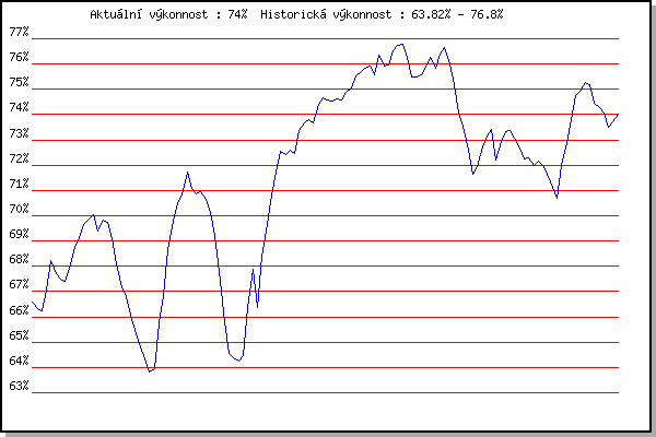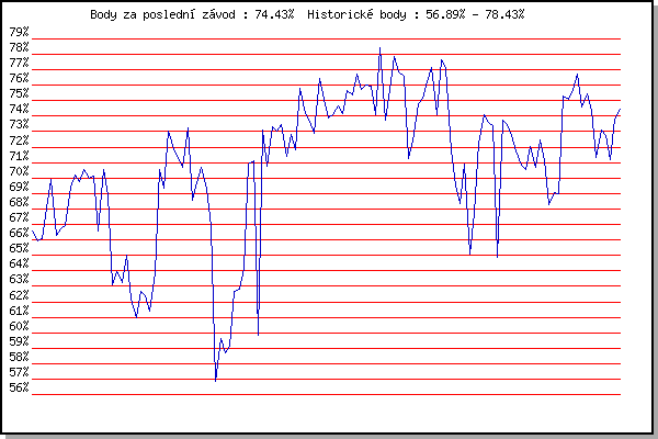 ZávodBodyVýkonnostZměna| 17.05.2006 | Pisárky Anthropos, 6.6 km | 66.60% | 66.60% | | | 24.05.2006 | Obřany, 8.8 km | 65.96% | 66.32% | -0.28% | | 31.05.2006 | Palackého vrch vodárna, 9 km | 66.10% | 66.24% | -0.08% | | 07.06.2006 | Líšeň Mariánské údolí, 11.1 km | 68.10% | 67.06% | +0.82% | | 28.06.2006 | Pisárky Anthropos, 6.6 km | 69.92% | 68.21% | +1.15% | | 12.07.2006 | Obřany, 8.8 km | 66.26% | 67.70% | -0.51% | | 19.07.2006 | Líšeň Mariánské údolí, 11.1 km | 66.75% | 67.50% | -0.20% | | 16.08.2006 | Obřany, 8.8 km | 66.91% | 67.39% | -0.11% | | 30.08.2006 | Veselka Popůvky Vintrovna, 7.9 km | 69.44% | 68.05% | +0.66% | | 16.05.2007 | Pisárky Anthropos, 6.6 km | 70.18% | 68.75% | +0.70% | | 23.05.2007 | Obřany, 8.8 km | 69.75% | 69.13% | +0.38% | | 06.06.2007 | Veselka, Popůvky Vintrovna, 7.9 km | 70.55% | 69.64% | +0.51% | | 13.06.2007 | Pisárky Anthropos, 6.6 km | 70.00% | 69.88% | +0.24% | | 27.06.2007 | Obřany, 8.8 km | 70.09% | 70.05% | +0.17% | | 04.07.2007 | Líšeň Mariánské údolí, 11.1 km | 66.56% | 69.40% | -0.65% | | 11.07.2007 | Veselka, Popůvky Vintrovna, 7.9 km | 70.53% | 69.84% | +0.44% | | 25.07.2007 | Pisárky Anthropos, 6.6 km | 68.90% | 69.75% | -0.09% | | 14.05.2008 | Pisárky Anthropos, 6.3 km | 63.11% | 69.09% | -0.66% | | 21.05.2008 | Obřany, 8.8 km | 63.94% | 68.08% | -1.01% | | 28.05.2008 | Líšeň Mariánské údolí, 11.1 km | 63.23% | 67.16% | -0.92% | | 11.06.2008 | Pisárky Anthropos, 6.3 km | 65.02% | 66.81% | -0.35% | | 18.06.2008 | Obřany, 8.8 km | 62.19% | 66.09% | -0.72% | | 25.06.2008 | Běh Olympijského dne, 7.1 km | 60.98% | 65.33% | -0.76% | | 02.07.2008 | Líšeň Mariánské údolí, 11.1 km | 62.64% | 64.82% | -0.51% | | 16.07.2008 | Pisárky Anthropos, 6.3 km | 62.36% | 64.34% | -0.48% | | 30.07.2008 | Obřany, 8.8 km | 61.41% | 63.82% | -0.52% | | 13.08.2008 | Veselka, Popůvky Vintrovna, 7.9 km | 63.86% | 63.95% | +0.13% | | 13.05.2009 | Pisárky Anthropos, 6.3 km | 70.57% | 65.78% | +1.83% | | 20.05.2009 | Obřany, 8.8 km | 69.33% | 66.86% | +1.08% | | 27.05.2009 | Líšeň Mariánské údolí, 11.1 km | 73.04% | 68.67% | +1.81% | | 03.06.2009 | Veselka, Popůvky Vintrovna, 7.9 km | 71.93% | 69.79% | +1.12% | | 10.06.2009 | Pisárky Anthropos, 6.3 km | 71.25% | 70.48% | +0.69% | | 17.06.2009 | Obřany, 8.8 km | 70.68% | 70.84% | +0.36% | | 24.06.2009 | Palackého vrch Běh Olympijského dne | 73.28% | 71.71% | +0.87% | | 15.07.2009 | Pisárky Anthropos, 6.3 km | 68.57% | 71.10% | -0.61% | | 29.07.2009 | Obřany, 8.8 km | 69.67% | 70.87% | -0.23% | | 05.08.2009 | Líšeň Mariánské údolí, 11.1 km | 70.71% | 70.94% | +0.07% | | 12.08.2009 | Veselka, Popůvky Vintrovna, 7.9 km | 69.31% | 70.64% | -0.30% | | 19.08.2009 | Moravská Slavia dráha, 10 km | 66.85% | 70.11% | -0.53% | | 30.06.2010 | Obřany, 8.8 km | 56.89% | 69.23% | -0.88% | | 07.07.2010 | Líšeň Mariánské údolí, 11.1 km | 59.60% | 67.42% | -1.81% | | 14.07.2010 | Veselka, Popůvky Vintrovna, 7.9 km | 58.73% | 65.80% | -1.62% | | 28.07.2010 | Pisárky Anthropos, 6.3 km | 59.12% | 64.54% | -1.26% | | 11.08.2010 | Obřany, 8.8 km | 62.70% | 64.37% | -0.17% | | 01.09.2010 | Veselka, Popůvky Vintrovna, 7.9 km | 62.85% | 64.24% | -0.13% | | 08.09.2010 | Pisárky Anthropos, 6.3 km | 64.17% | 64.47% | +0.23% | | 11.05.2011 | Pisárky Anthropos, 6 km | 70.93% | 66.39% | +1.92% | | 18.05.2011 | Palackého vrch, 7.1 km | 71.09% | 67.90% | +1.51% | | 25.05.2011 | Obřany, 8.8 km | 59.81% | 66.37% | -1.53% | | 01.06.2011 | Líšeň Mariánské údolí, 11.1 km | 73.09% | 68.42% | +2.05% | | 08.06.2011 | Veselka, Popůvky Vintrovna, 7.9 km | 70.77% | 69.41% | +0.99% | | 15.06.2011 | Pisárky Anthropos, 6 km | 73.32% | 70.80% | +1.39% | | 29.06.2011 | Obřany, 8.8 km | 73.04% | 71.74% | +0.94% | | 27.07.2011 | Pisárky Anthropos, 6 km | 73.49% | 72.54% | +0.80% | | 03.08.2011 | Palackého vrch, 7.1 km | 71.43% | 72.40% | -0.14% | | 24.08.2011 | Líšeň Mariánské údolí, 11.1 km | 72.85% | 72.59% | +0.19% | | 31.08.2011 | Popůvky, 7.9 km | 71.84% | 72.48% | -0.11% | | 09.05.2012 | Pisárky Anthropos, 6 km | 75.77% | 73.38% | +0.90% | | 16.05.2012 | Palackého vrch, 7.1 km | 74.20% | 73.68% | +0.30% | | 23.05.2012 | Obřany, 8.8 km | 73.69% | 73.78% | +0.10% | | 30.05.2012 | Líšeň Mariánské údolí, 11 km | 72.87% | 73.65% | -0.13% | | 06.06.2012 | Popůvky, 7.9 km | 76.41% | 74.41% | +0.76% | | 13.06.2012 | Pisárky Anthropos, 6 km | 75.07% | 74.65% | +0.24% | | 20.06.2012 | Palackého vrch – Běh Olympijského dne | 73.90% | 74.56% | -0.09% | | 27.06.2012 | Obřany, 8.8 km | 74.11% | 74.53% | -0.03% | | 11.07.2012 | Popůvky, 7.9 km | 74.68% | 74.63% | +0.10% | | 18.07.2012 | Atletický stadión Pod Palackého vrche | 74.16% | 74.56% | -0.07% | | 25.07.2012 | Pisárky Anthropos, 6 km | 75.67% | 74.87% | +0.31% | | 08.08.2012 | Obřany, 8.8 km | 75.40% | 75.05% | +0.18% | | 22.08.2012 | Líšeň Mariánské údolí, 11 km | 76.72% | 75.52% | +0.47% | | 29.08.2012 | Pisárky Anthropos, 6 km | 75.73% | 75.64% | +0.12% | | 05.09.2012 | Popůvky, 7.9 km | 76.02% | 75.81% | +0.17% | | 12.09.2012 | Líšeň Mariánské údolí, 11 km | 75.94% | 75.91% | +0.10% | | 28.09.2012 | Blažovice – Svatováclavský běh, 11 km | 74.12% | 75.57% | -0.34% | | 15.05.2013 | Pisárky Anthropos, 6 km | 78.43% | 76.37% | +0.80% | | 22.05.2013 | Palackého vrch, 7.1 km | 73.76% | 75.91% | -0.46% | | 29.05.2013 | Obřany, 8.8 km | 75.75% | 75.97% | +0.06% | | 05.06.2013 | Líšeň, 11 km | 77.86% | 76.54% | +0.57% | | 12.06.2013 | Popůvky, 7.3 km | 76.86% | 76.73% | +0.19% | | 19.06.2013 | Pisárky Anthropos, 6 km | 76.61% | 76.80% | +0.07% | | 17.07.2013 | Atletický stadión Pod Palackého vrche | 71.27% | 76.26% | -0.54% | | 24.07.2013 | Pisárky Anthropos, 6 km | 72.41% | 75.50% | -0.76% | | 31.07.2013 | Palackého vrch, 7.1 km | 74.80% | 75.48% | -0.02% | | 07.08.2013 | Obřany, 8.8 km | 75.16% | 75.55% | +0.07% | | 21.08.2013 | Líšeň, 11 km 